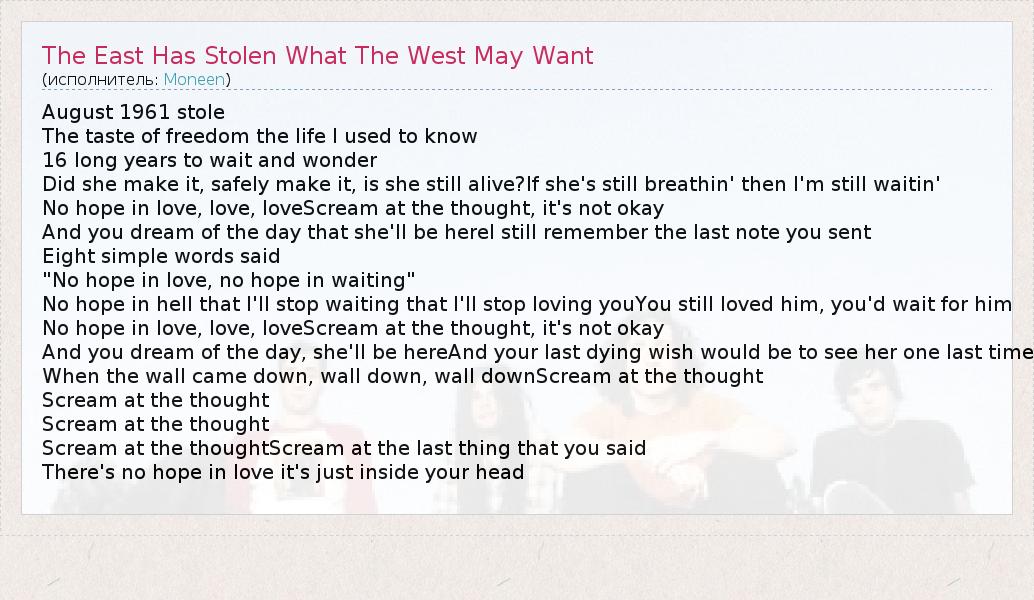 А как ты думаешь, о чем песня "The East Has Stolen What The West May Want" ?