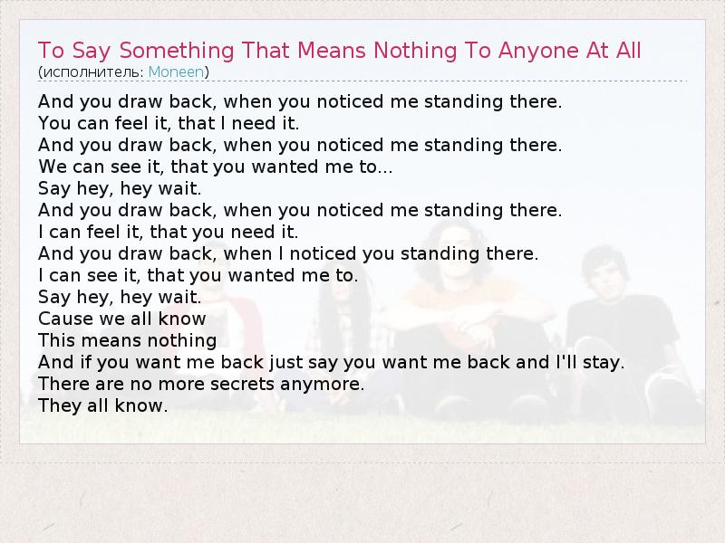 And you draw back, when you noticed me standing there. You can feel it, that I need it. And you draw back, when you noticed me standing there. We can see it, that you wanted me to... Say hey, hey wait. And you draw back, when you noticed me standing there. I can feel it, that you need it. And you draw back, when I noticed you standing there. I can see it, that you wanted me to. Say hey, hey wait. Cause we all know This means nothing And if you want me back just say you want me back and I'll stay. There are no more secrets anymore. They all know.