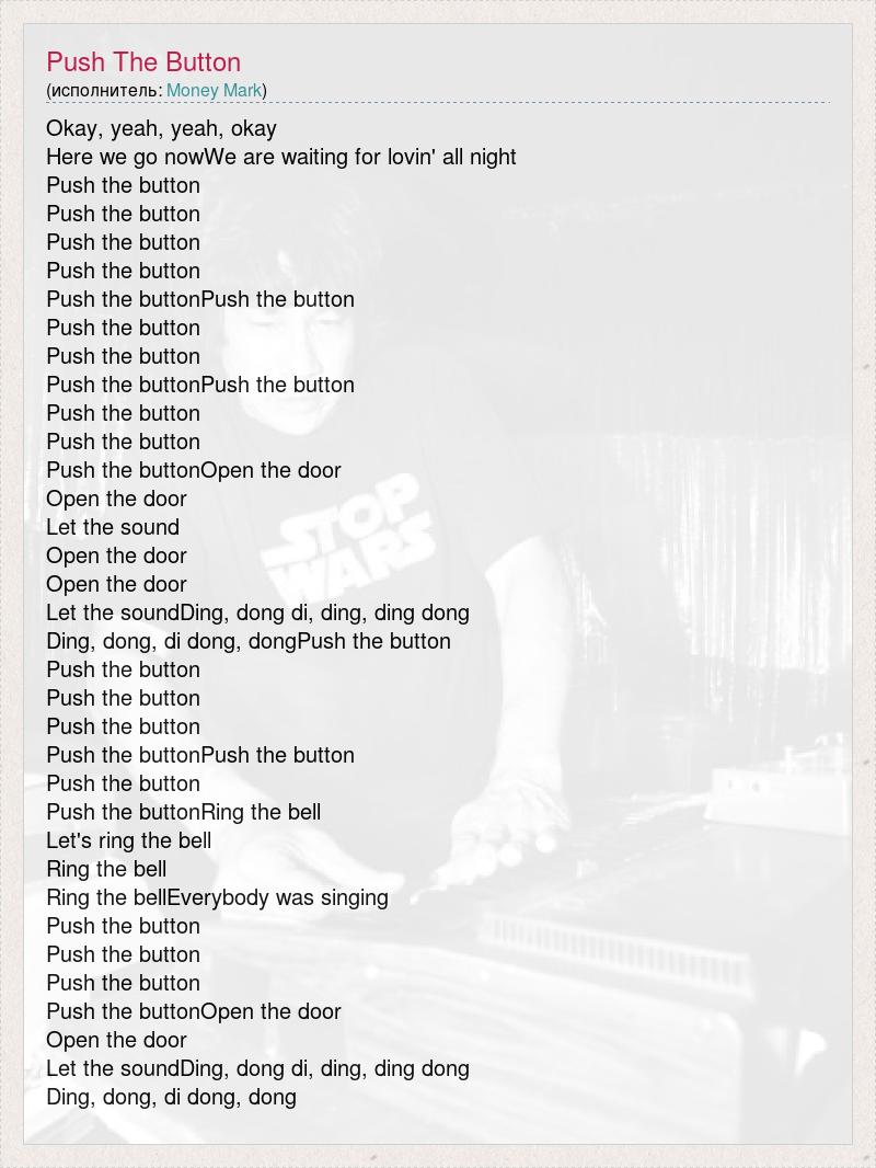 Okay, yeah, yeah, okay Here we go nowWe are waiting for lovin' all night Push the button Push the button Push the button Push the button Push the buttonPush the button Push the button Push the button Push the buttonPush the button Push the button Push the button Push the buttonOpen the door Open the door Let the sound Open the door Open the door Let the soundDing, dong di, ding, ding dong Ding, dong, di dong, dongPush the button Push the button Push the button Push the button Push the buttonPush the button Push the button Push the buttonRing the bell Let's ring the bell Ring the bell Ring the bellEverybody was singing Push the button Push the button Push the button Push the buttonOpen the door Open the door Let the soundDing, dong di, ding, ding dong Ding, dong, di dong, dong