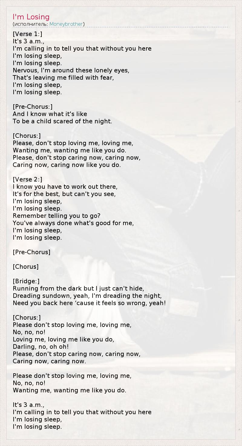 [Verse 1:] It's 3 a.m., I'm calling in to tell you that without you here I'm losing sleep, I'm losing sleep. Nervous, I'm around these lonely eyes, That's leaving me filled with fear, I'm losing sleep, I'm losing sleep. [Pre-Chorus:] And I know what it's like To be a child scared of the night. [Chorus:] Please, don't stop loving me, loving me, Wanting me, wanting me like you do. Please, don't stop caring now, caring now, Caring now, caring now like you do. [Verse 2:] I know you have to work out there, It's for the best, but can't you see, I'm losing sleep, I'm losing sleep. Remember telling you to go? You've always done what's good for me, I'm losing sleep, I'm losing sleep. [Pre-Chorus] [Chorus] [Bridge:] Running from the dark but I just can't hide, Dreading sundown, yeah, I'm dreading the night, Need you back here ‘cause it feels so wrong, yeah! [Chorus:] Please don't stop loving me, loving me, No, no, no! Loving me, loving me like you do, Darling, no, oh oh! Please, don't stop caring now, caring now, Caring now, caring now. Please don't stop loving me, loving me, No, no, no! Wanting me, wanting me like you do. It's 3 a.m., I'm calling in to tell you that without you here I'm losing sleep, I'm losing sleep.