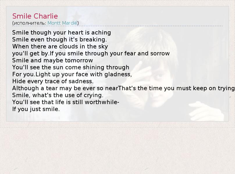 А как ты думаешь, о чем песня "Smile Charlie" ?