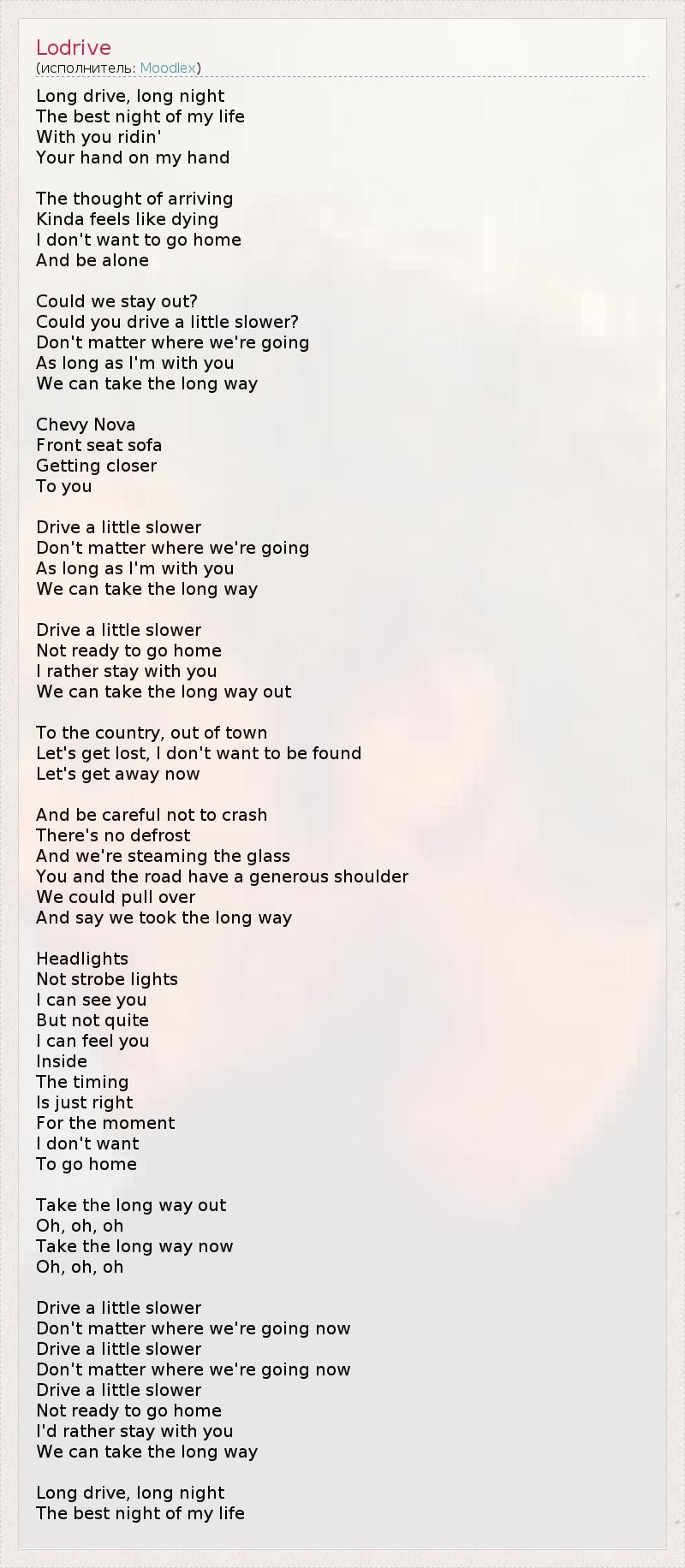 Долгая поездка, длинная ночь, Лучшая ночь в моей жизни, Когда ты едешь со мной, А твоя рука на моей руке. Мысли о том, что мы приедем, Подобны смерти. Я не хочу домой, Чтобы остаться там одному. Может, не будем возвращаться? Можешь ехать немного помедленнее? Неважно, куда мы направляемся, Когда я с тобой. Мы можем ехать и ехать. Шеви Нова, 1 Переднее сидение – Так я ближе К тебе. Сбрось скорость. Неважно, куда мы направляемся, Когда я с тобой. Мы можем ехать и ехать. Сбрось скорость. Я пока не хочу домой. Лучше я побуду с тобой. Мы можем ехать и ехать... В сельскую местность, за город. Давай потеряемся. Я не хочу, чтобы нас нашли. Давай от всех убежим. Будь осторожна, чтобы мы не разбились. У нас нет антиобледнителя, И мы пытаемся согреть стёкла дыханием. Только ты и бескрайняя дорога. Мы могли бы остановиться на обочине И сказать, что мы проделали большой путь. Огни фар, Никаких проблесковых маячков. Я вижу тебя, Но не чётко. Я чувствую тебя Внутри. Время Сейчас Пришло. Я не хочу Домой. Давай ехать и ехать. О-о-о. Давай ехать и ехать. О-о-о. Сбрось скорость. Неважно, куда мы направляемся. Сбрось скорость. Неважно, куда мы направляемся. Сбрось скорость. Я пока не хочу домой, Лучше я побуду с тобой. Мы можем ехать и ехать... Долгая поездка, длинная ночь, Лучшая ночь в моей жизни... 1 – Chevrolet Nova – легковой автомобиль от компании GM Chevrolet, выпускавшийся с 1962 по 1979 годы.