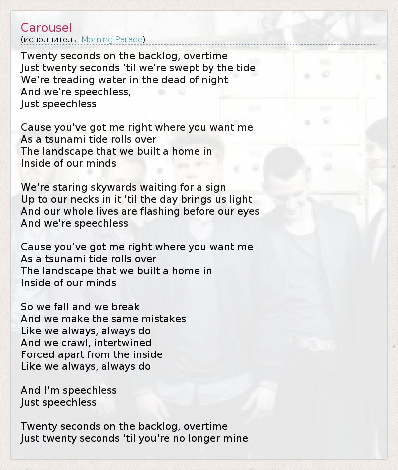 Twenty seconds on the backlog, overtime Just twenty seconds 'til we're swept by the tide We're treading water in the dead of night And we're speechless, Just speechless Cause you've got me right where you want me As a tsunami tide rolls over The landscape that we built a home in Inside of our minds We're staring skywards waiting for a sign Up to our necks in it 'til the day brings us light And our whole lives are flashing before our eyes And we're speechless Cause you've got me right where you want me As a tsunami tide rolls over The landscape that we built a home in Inside of our minds So we fall and we break And we make the same mistakes Like we always, always do And we crawl, intertwined Forced apart from the inside Like we always, always do And I'm speechless Just speechless Twenty seconds on the backlog, overtime Just twenty seconds 'til you're no longer mine