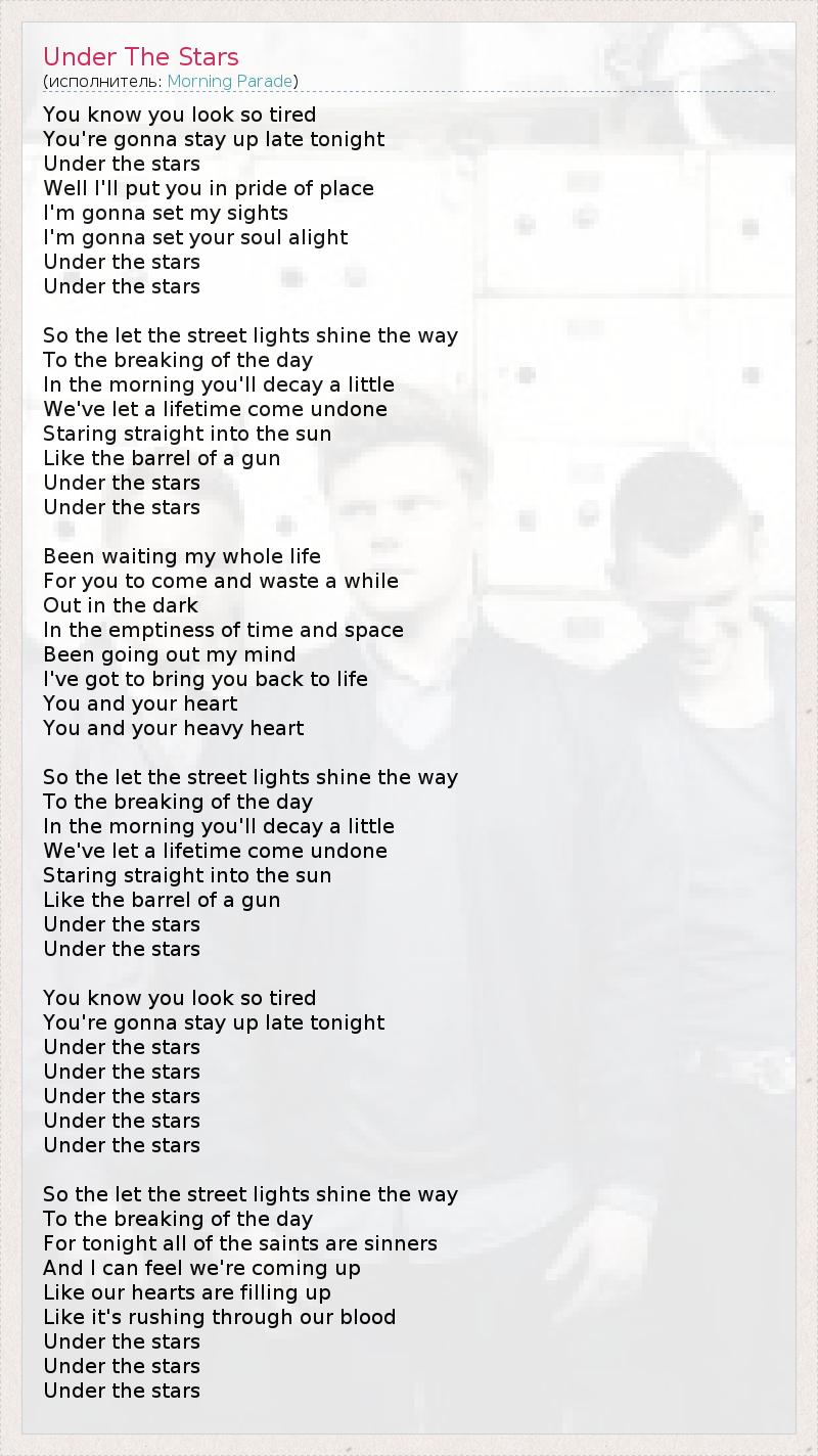 Знаешь, ты выглядишь такой уставшей. Ты будешь бодрствовать всю ночь под звездами. Хорошо, я отведу тебе почетное место, я уделю тебе все внимание. Я удостоверюсь, что твоя душа довольна под звездами. Под звездами. И пусть уличный свет покажет путь к завершению дня. К утру ты угаснешь немного, мы позволили жизни раскрыться, Таращась прямо на солнце, как в дуло пистолета под звездами, Под звездами. Я ждал всю свою жизнь тебя и потерялся немного там в темноте. В пустоте времени и пространства я сходил с ума. Я верну тебя к жизни, Тебя и твое сердце, Тебя и твое тяжелое сердце. И пусть уличный свет покажет путь к завершению дня. К утру ты угаснешь немного, мы позволили жизни раскрыться, Таращась прямо на солнце как в дуло пистолета под звездами, Под звездами. Знаешь, ты выглядишь такой уставшей. Ты будешь бодрствовать всю ночь под звездами. Под звездами. Под звездами. Под звездами. Под звездами. И пусть уличный свет покажет путь к завершению дня. Сегодня вечером все святые - грешники, и я чувствую, как мы поднимаемся, Как наши сердца наполняются, как будто это течет по нашим венам под звездами. Под звездами. Под звездами.