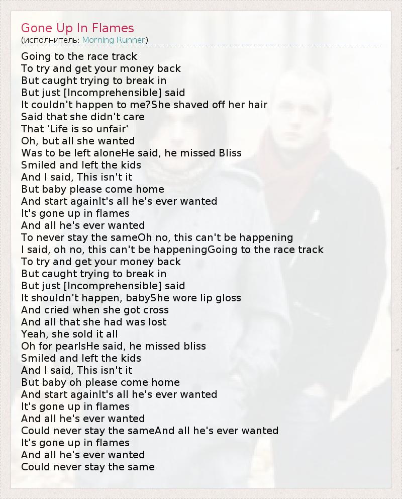 Going to the race track To try and get your money back But caught trying to break in But just [Incomprehensible] said It couldn't happen to me?She shaved off her hair Said that she didn't care That 'Life is so unfair' Oh, but all she wanted Was to be left aloneHe said, he missed Bliss Smiled and left the kids And I said, This isn't it But baby please come home And start againIt's all he's ever wanted It's gone up in flames And all he's ever wanted To never stay the sameOh no, this can't be happening I said, oh no, this can't be happeningGoing to the race track To try and get your money back But caught trying to break in But just [Incomprehensible] said It shouldn't happen, babyShe wore lip gloss And cried when she got cross And all that she had was lost Yeah, she sold it all Oh for pearlsHe said, he missed bliss Smiled and left the kids And I said, This isn't it But baby oh please come home And start againIt's all he's ever wanted It's gone up in flames And all he's ever wanted Could never stay the sameAnd all he's ever wanted It's gone up in flames And all he's ever wanted Could never stay the same