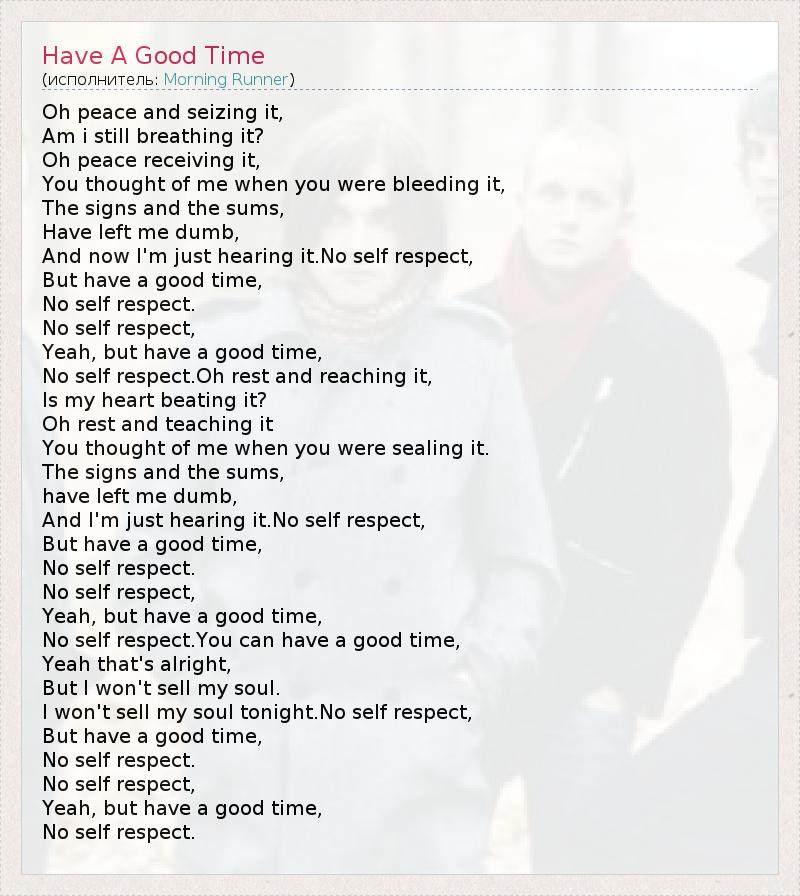 Oh peace and seizing it, Am i still breathing it? Oh peace receiving it, You thought of me when you were bleeding it, The signs and the sums, Have left me dumb, And now I'm just hearing it.No self respect, But have a good time, No self respect. No self respect, Yeah, but have a good time, No self respect.Oh rest and reaching it, Is my heart beating it? Oh rest and teaching it You thought of me when you were sealing it. The signs and the sums, have left me dumb, And I'm just hearing it.No self respect, But have a good time, No self respect. No self respect, Yeah, but have a good time, No self respect.You can have a good time, Yeah that's alright, But I won't sell my soul. I won't sell my soul tonight.No self respect, But have a good time, No self respect. No self respect, Yeah, but have a good time, No self respect.