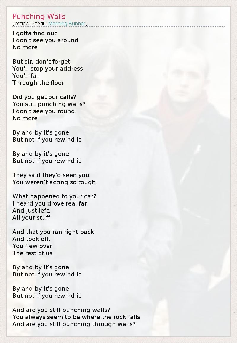 I gotta find out I don't see you around No more But sir, don't forget You'll stop your address You'll fall Through the floor Did you get our calls? You still punching walls? I don't see you round No more By and by it's gone But not if you rewind it By and by it's gone But not if you rewind it They said they'd seen you You weren't acting so tough What happened to your car? I heard you drove real far And just left, All your stuff And that you ran right back And took off. You flew over The rest of us By and by it's gone But not if you rewind it By and by it's gone But not if you rewind it And are you still punching walls? You always seem to be where the rock falls And are you still punching through walls?