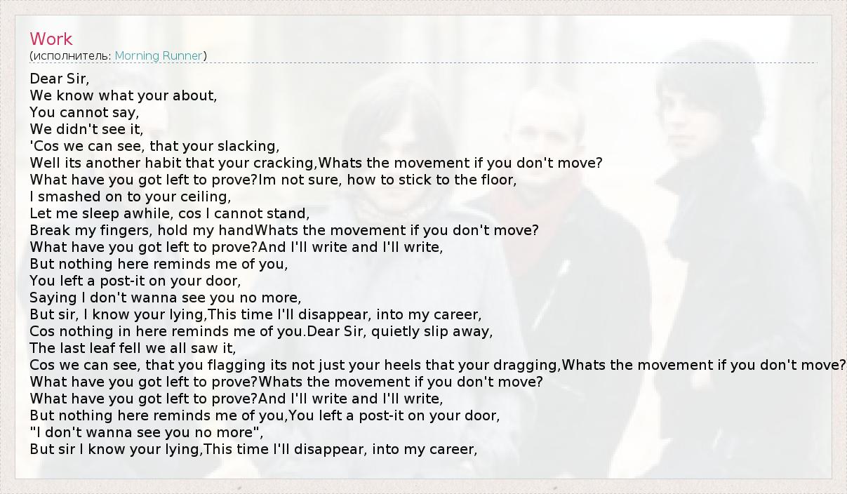 Dear Sir, We know what your about, You cannot say, We didn't see it, 'Cos we can see, that your slacking, Well its another habit that your cracking,Whats the movement if you don't move? What have you got left to prove?Im not sure, how to stick to the floor, I smashed on to your ceiling, Let me sleep awhile, cos I cannot stand, Break my fingers, hold my handWhats the movement if you don't move? What have you got left to prove?And I'll write and I'll write, But nothing here reminds me of you, You left a post-it on your door, Saying I don't wanna see you no more, But sir, I know your lying,This time I'll disappear, into my career, Cos nothing in here reminds me of you.Dear Sir, quietly slip away, The last leaf fell we all saw it, Cos we can see, that you flagging its not just your heels that your dragging,Whats the movement if you don't move? What have you got left to prove?Whats the movement if you don't move? What have you got left to prove?And I'll write and I'll write, But nothing here reminds me of you,You left a post-it on your door, "I don't wanna see you no more", But sir I know your lying,This time I'll disappear, into my career,