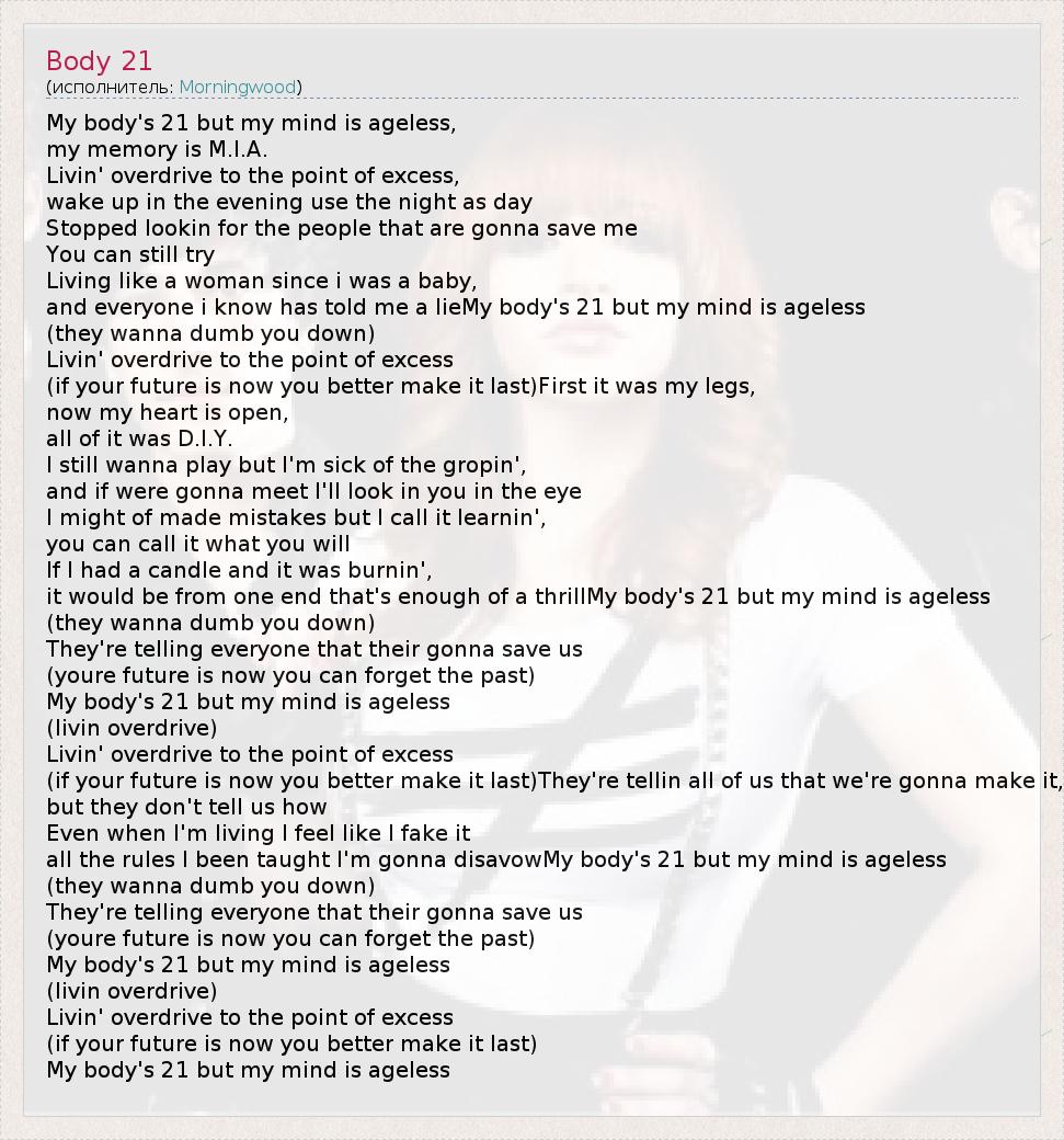 My body's 21 but my mind is ageless, my memory is M.I.A. Livin' overdrive to the point of excess, wake up in the evening use the night as day Stopped lookin for the people that are gonna save me You can still try Living like a woman since i was a baby, and everyone i know has told me a lieMy body's 21 but my mind is ageless (they wanna dumb you down) Livin' overdrive to the point of excess (if your future is now you better make it last)First it was my legs, now my heart is open, all of it was D.I.Y. I still wanna play but I'm sick of the gropin', and if were gonna meet I'll look in you in the eye I might of made mistakes but I call it learnin', you can call it what you will If I had a candle and it was burnin', it would be from one end that's enough of a thrillMy body's 21 but my mind is ageless (they wanna dumb you down) They're telling everyone that their gonna save us (youre future is now you can forget the past) My body's 21 but my mind is ageless (livin overdrive) Livin' overdrive to the point of excess (if your future is now you better make it last)They're tellin all of us that we're gonna make it, but they don't tell us how Even when I'm living I feel like I fake it all the rules I been taught I'm gonna disavowMy body's 21 but my mind is ageless (they wanna dumb you down) They're telling everyone that their gonna save us (youre future is now you can forget the past) My body's 21 but my mind is ageless (livin overdrive) Livin' overdrive to the point of excess (if your future is now you better make it last) My body's 21 but my mind is ageless