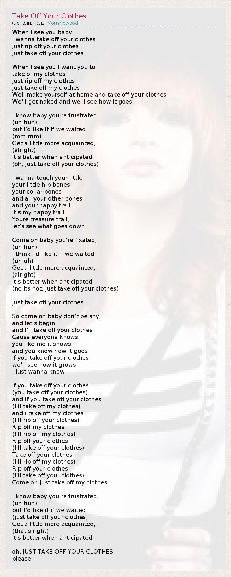 When I see you baby I wanna take off your clothes Just rip off your clothes Just take off your clothes When I see you I want you to take of my clothes Just rip off my clothes Just take off my clothes Well make yourself at home and take off your clothes We'll get naked and we'll see how it goes I know baby you're frustrated (uh huh) but I'd like it if we waited (mm mm) Get a little more acquainted, (alright) it's better when anticipated (oh, Just take off your clothes) I wanna touch your little your little hip bones your collar bones and all your other bones and your happy trail it's my happy trail Youre treasure trail, let's see what goes down Come on baby you're fixated, (uh huh) I think I'd like it if we waited (uh uh) Get a little more acquainted, (alright) it's better when anticipated (no its not, just take off your clothes) Just take off your clothes So come on baby don't be shy, and let's begin and I'll take off your clothes Cause everyone knows you like me it shows and you know how it goes If you take off your clothes we'll see how it grows I just wanna know If you take off your clothes (you take off your clothes) and if you take off your clothes (I'll take off my clothes) and i take off my clothes (I'll rip off your clothes) Rip off my clothes (I'll rip off my clothes) Rip off your clothes (I'll take off your clothes) Take off your clothes (I'll rip off my clothes) Rip off your clothes (I'll take off your clothes) Come on just take off my clothes I know baby you're frustrated, (uh huh) but I'd like it if we waited (just take off your clothes) Get a little more acquainted, (that's right) it's better when anticipated oh, JUST TAKE OFF YOUR CLOTHES please