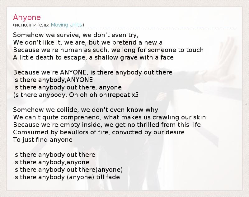 Somehow we survive, we don't even try, We don't like it, we are, but we pretend a new a Because we're human as such, we long for someone to touch A little death to escape, a shallow grave with a face Because we're ANYONE, is there anybody out there is there anybody,ANYONE is there anybody out there, anyone (s there anybody, Oh oh oh oh)repeat x5 Somehow we collide, we don't even know why We can't quite comprehend, what makes us crawling our skin Because we're empty inside, we get no thrilled from this life Comsumed by beaullors of fire, convicted by our desire To just find anyone is there anybody out there is there anybody,anyone is there anybody out there(anyone) is there anybody (anyone) till fade