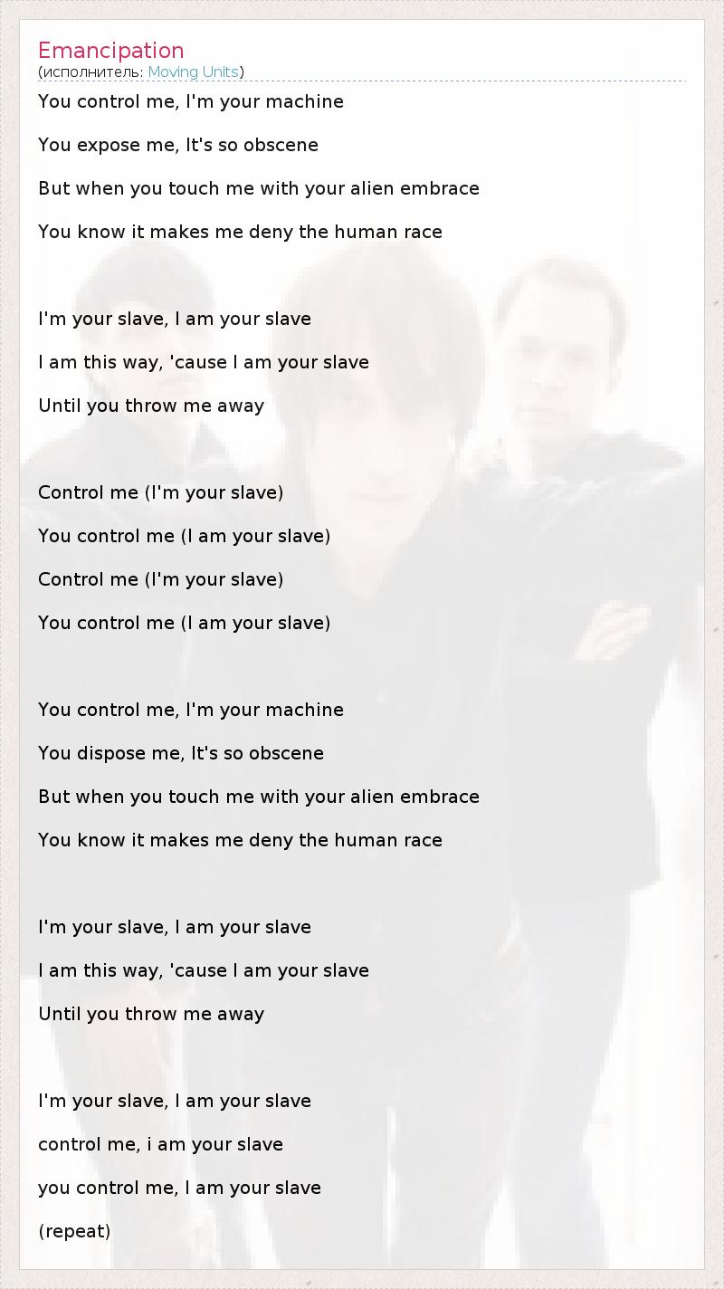 You control me, I'm your machine You expose me, It's so obscene But when you touch me with your alien embrace You know it makes me deny the human race I'm your slave, I am your slave I am this way, 'cause I am your slave Until you throw me away Control me (I'm your slave) You control me (I am your slave) Control me (I'm your slave) You control me (I am your slave) You control me, I'm your machine You dispose me, It's so obscene But when you touch me with your alien embrace You know it makes me deny the human race I'm your slave, I am your slave I am this way, 'cause I am your slave Until you throw me away I'm your slave, I am your slave control me, i am your slave you control me, I am your slave (repeat)