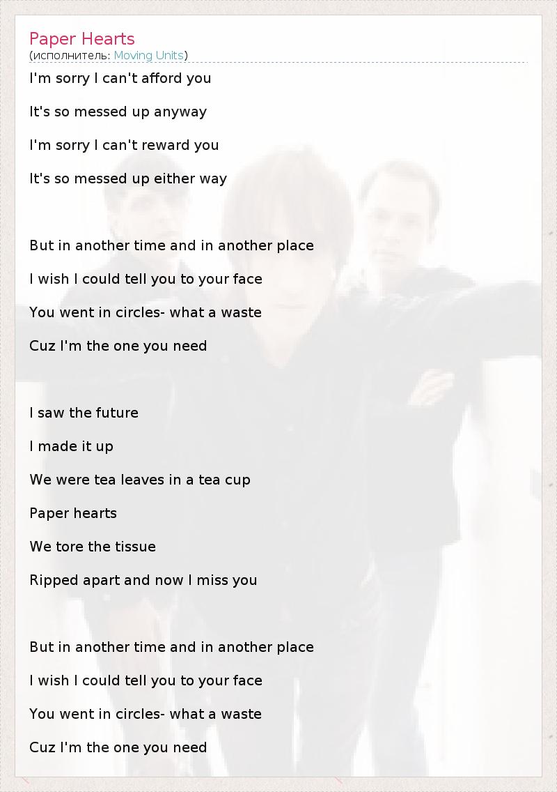 I'm sorry I can't afford you It's so messed up anyway I'm sorry I can't reward you It's so messed up either way But in another time and in another place I wish I could tell you to your face You went in circles- what a waste Cuz I'm the one you need I saw the future I made it up We were tea leaves in a tea cup Paper hearts We tore the tissue Ripped apart and now I miss you But in another time and in another place I wish I could tell you to your face You went in circles- what a waste Cuz I'm the one you need