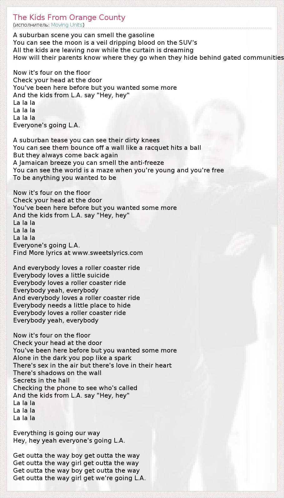 A suburban scene you can smell the gasoline You can see the moon is a veil dripping blood on the SUV's All the kids are leaving now while the curtain is dreaming How will their parents know where they go when they hide behind gated communities Now it's four on the floor Check your head at the door You've been here before but you wanted some more And the kids from L.A. say "Hey, hey" La la la La la la La la la Everyone's going L.A. A suburban tease you can see their dirty knees You can see them bounce off a wall like a racquet hits a ball But they always come back again A Jamaican breeze you can smell the anti-freeze You can see the world is a maze when you're young and you're free To be anything you wanted to be Now it's four on the floor Check your head at the door You've been here before but you wanted some more And the kids from L.A. say "Hey, hey" La la la La la la La la la Everyone's going L.A. Find More lyrics at www.sweetslyrics.com And everybody loves a roller coaster ride Everybody loves a little suicide Everybody loves a roller coaster ride Everybody yeah, everybody And everybody loves a roller coaster ride Everybody needs a little place to hide Everybody loves a roller coaster ride Everybody yeah, everybody Now it's four on the floor Check your head at the door You've been here before but you wanted some more Alone in the dark you pop like a spark There's sex in the air but there's love in their heart There's shadows on the wall Secrets in the hall Checking the phone to see who's called And the kids from L.A. say "Hey, hey" La la la La la la La la la Everything is going our way Hey, hey yeah everyone's going L.A. Get outta the way boy get outta the way Get outta the way girl get outta the way Get outta the way boy get outta the way Get outta the way girl get we're going L.A.
