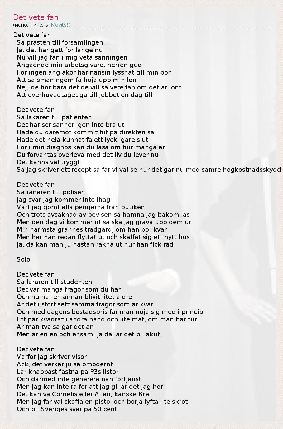 Det vete fan Sa prasten till forsamlingen Ja, det har gatt for lange nu Nu vill jag fan i mig veta sanningen Angaende min arbetsgivare, herren gud For ingen anglakor har nansin lyssnat till min bon Att sa smaningom fa hoja upp min lon Nej, de hor bara det de vill sa vete fan om det ar lont Att overhuvudtaget ga till jobbet en dag till Det vete fan Sa lakaren till patienten Det har ser sannerligen inte bra ut Hade du daremot kommit hit pa direkten sa Hade det hela kunnat fa ett lyckligare slut For i min diagnos kan du lasa om hur manga ar Du forvantas overleva med det liv du lever nu Det kanns val tryggt Sa jag skriver ett recept sa far vi val se hur det gar nu med samre hogkostnadsskydd Det vete fan Sa ranaren till polisen Jag svar jag kommer inte ihag Vart jag gomt alla pengarna fran butiken Och trots avsaknad av bevisen sa hamna jag bakom las Men den dag vi kommer ut sa ska jag grava upp dem ur Min narmsta grannes tradgard, om han bor kvar Men har han redan flyttat ut och skaffat sig ett nytt hus Ja, da kan man ju nastan rakna ut hur han fick rad Solo Det vete fan Sa lararen till studenten Det var manga fragor som du har Och nu nar en annan blivit litet aldre Ar det i stort sett samma fragor som ar kvar Och med dagens bostadspris far man noja sig med i princip Ett par kvadrat i andra hand och lite mat, om man har tur Ar man tva sa gar det an Men ar en en och ensam, ja da lar det bli akut Det vete fan Varfor jag skriver visor Ack, det verkar ju sa omodernt Lar knappast fastna pa P3s listor Och darmed inte generera nan fortjanst Men jag kan inte ra for att jag gillar det jag hor Det kan va Cornelis eller Allan, kanske Brel Men jag far val skaffa en pistol och borja lyfta lite skrot Och bli Sveriges svar pa 50 cent