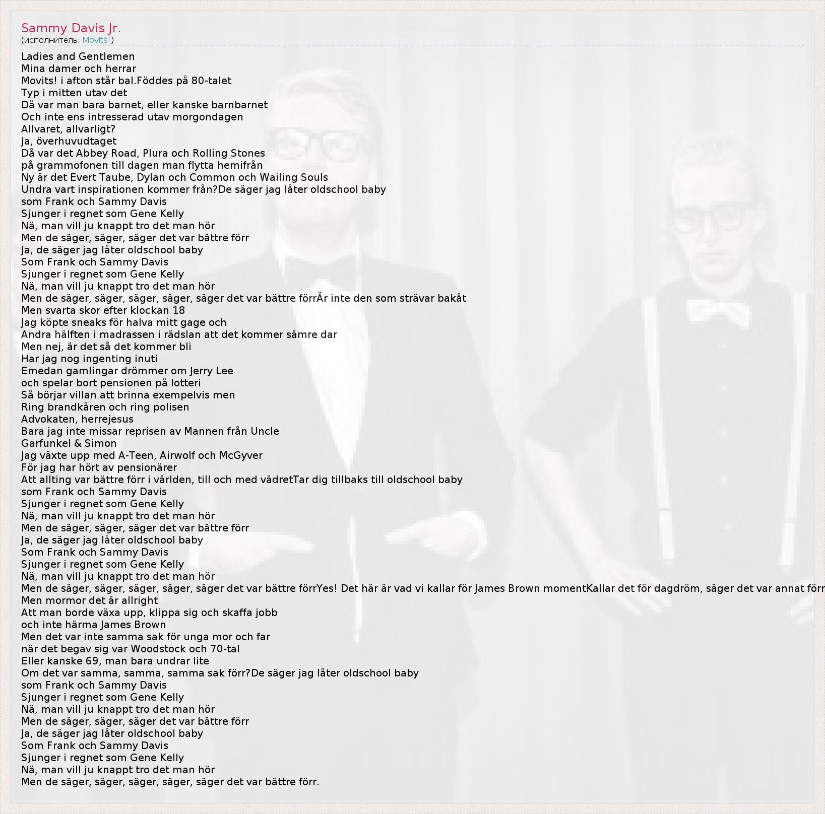 Ladies and Gentlemen Mina damer och herrar Movits! i afton står bal.Föddes på 80-talet Typ i mitten utav det Då var man bara barnet, eller kanske barnbarnet Och inte ens intresserad utav morgondagen Allvaret, allvarligt? Ja, överhuvudtaget Då var det Abbey Road, Plura och Rolling Stones på grammofonen till dagen man flytta hemifrån Ny är det Evert Taube, Dylan och Common och Wailing Souls Undra vart inspirationen kommer från?De säger jag låter oldschool baby som Frank och Sammy Davis Sjunger i regnet som Gene Kelly Nä, man vill ju knappt tro det man hör Men de säger, säger, säger det var bättre förr Ja, de säger jag låter oldschool baby Som Frank och Sammy Davis Sjunger i regnet som Gene Kelly Nä, man vill ju knappt tro det man hör Men de säger, säger, säger, säger, säger det var bättre förrÄr inte den som strävar bakåt Men svarta skor efter klockan 18 Jag köpte sneaks för halva mitt gage och Andra hälften i madrassen i rädslan att det kommer sämre dar Men nej, är det så det kommer bli Har jag nog ingenting inuti Emedan gamlingar drömmer om Jerry Lee och spelar bort pensionen på lotteri Så börjar villan att brinna exempelvis men Ring brandkåren och ring polisen Advokaten, herrejesus Bara jag inte missar reprisen av Mannen från Uncle Garfunkel & Simon Jag växte upp med A-Teen, Airwolf och McGyver För jag har hört av pensionärer Att allting var bättre förr i världen, till och med vädretTar dig tillbaks till oldschool baby som Frank och Sammy Davis Sjunger i regnet som Gene Kelly Nä, man vill ju knappt tro det man hör Men de säger, säger, säger det var bättre förr Ja, de säger jag låter oldschool baby Som Frank och Sammy Davis Sjunger i regnet som Gene Kelly Nä, man vill ju knappt tro det man hör Men de säger, säger, säger, säger, säger det var bättre förrYes! Det här är vad vi kallar för James Brown momentKallar det för dagdröm, säger det var annat förr Men mormor det är allright Att man borde växa upp, klippa sig och skaffa jobb och inte härma James Brown Men det var inte samma sak för unga mor och far när det begav sig var Woodstock och 70-tal Eller kanske 69, man bara undrar lite Om det var samma, samma, samma sak förr?De säger jag låter oldschool baby som Frank och Sammy Davis Sjunger i regnet som Gene Kelly Nä, man vill ju knappt tro det man hör Men de säger, säger, säger det var bättre förr Ja, de säger jag låter oldschool baby Som Frank och Sammy Davis Sjunger i regnet som Gene Kelly Nä, man vill ju knappt tro det man hör Men de säger, säger, säger, säger, säger det var bättre förr.