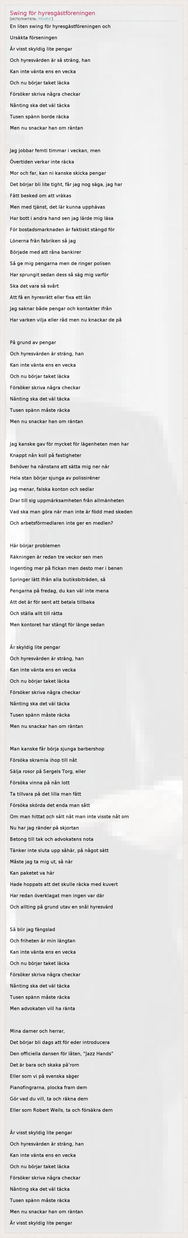 En liten swing för hyresgästföreningen och Ursäkta förseningen Är visst skyldig lite pengar Och hyresvärden är så sträng, han Kan inte vänta ens en vecka Och nu börjar taket läcka Försöker skriva några checkar Nånting ska det väl täcka Tusen spänn borde räcka Men nu snackar han om räntan Jag jobbar femti timmar i veckan, men Övertiden verkar inte räcka Mor och far, kan ni kanske skicka pengar Det börjar bli lite tight, får jag nog säga, jag har Fått besked om att vräkas Men med tjänst, det lär kunna upphävas Har bott i andra hand sen jag lärde mig läsa För bostadsmarknaden är faktiskt stängd för Lönerna från fabriken så jag Började med att råna bankirer Så ge mig pengarna men de ringer polisen Har sprungit sedan dess så säg mig varför Ska det vara så svårt Att få en hyresrätt eller fixa ett lån Jag saknar både pengar och kontakter ifrån Har varken vilja eller råd men nu knackar de på På grund av pengar Och hyresvärden är sträng, han Kan inte vänta ens en vecka Och nu börjar taket läcka Försöker skriva några checkar Nånting ska det väl täcka Tusen spänn måste räcka Men nu snackar han om räntan Jag kanske gav för mycket för lägenheten men har Knappt nån koll på fastigheter Behöver ha nånstans att sätta mig ner när Hela stan börjar sjunga av polissiréner Jag menar, falska konton och sedlar Drar till sig uppmärksamheten från allmänheten Vad ska man göra när man inte är född med skeden Och arbetsförmedlaren inte ger en medlen? Här börjar problemen Räkningen är redan tre veckor sen men Ingenting mer på fickan men desto mer i benen Springer lätt ifrån alla butiksbiträden, så Pengarna på fredag, du kan väl inte mena Att det är för sent att betala tillbaka Och ställa allt till rätta Men kontoret har stängt för länge sedan Är skyldig lite pengar Och hyresvärden är sträng, han Kan inte vänta ens en vecka Och nu börjar taket läcka Försöker skriva några checkar Nånting ska det väl täcka Tusen spänn måste räcka Men nu snackar han om räntan Man kanske får börja sjunga barbershop Försöka skramla ihop till nåt Sälja rosor på Sergels Torg, eller Försöka vinna på nån lott Ta tillvara på det lilla man fått Försöka skörda det enda man sått Om man hittat och sålt nåt man inte visste nåt om Nu har jag ränder på skjortan Betong till tak och advokatens nota Tänker inte sluta upp såhär, på något sätt Måste jag ta mig ut, så när Kan paketet va här Hade hoppats att det skulle räcka med kuvert Har redan överklagat men ingen var där Och allting på grund utav en snål hyresvärd Så blir jag fängslad Och friheten är min längtan Kan inte vänta ens en vecka Och nu börjar taket läcka Försöker skriva några checkar Nånting ska det väl täcka Tusen spänn måste räcka Men advokaten vill ha ränta Mina damer och herrar, Det börjar bli dags att för eder introducera Den officiella dansen för låten, "Jazz Hands" Det är bara och skaka på'rom Eller som vi på svenska säger Pianofingrarna, plocka fram dem Gör vad du vill, ta och räkna dem Eller som Robert Wells, ta och försäkra dem Är visst skyldig lite pengar Och hyresvärden är sträng, han Kan inte vänta ens en vecka Och nu börjar taket läcka Försöker skriva några checkar Nånting ska det väl täcka Tusen spänn måste räcka Men nu snackar han om räntan Är visst skyldig lite pengar