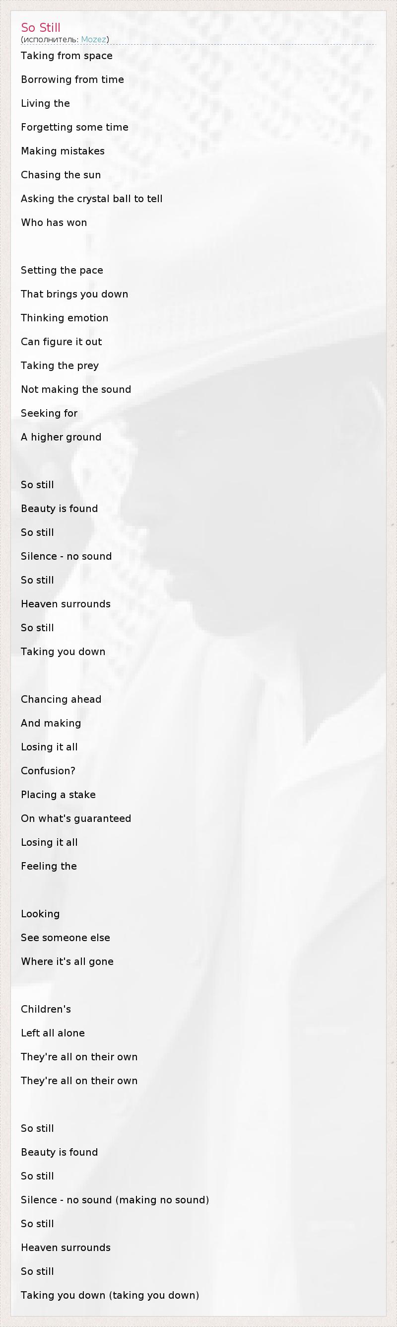 Taking from space Borrowing from time Living the Forgetting some time Making mistakes Chasing the sun Asking the crystal ball to tell Who has won Setting the pace That brings you down Thinking emotion Can figure it out Taking the prey Not making the sound Seeking for A higher ground So still Beauty is found So still Silence - no sound So still Heaven surrounds So still Taking you down Chancing ahead And making Losing it all Confusion? Placing a stake On what's guaranteed Losing it all Feeling the Looking See someone else Where it's all gone Children's Left all alone They're all on their own They're all on their own So still Beauty is found So still Silence - no sound (making no sound) So still Heaven surrounds So still Taking you down (taking you down)