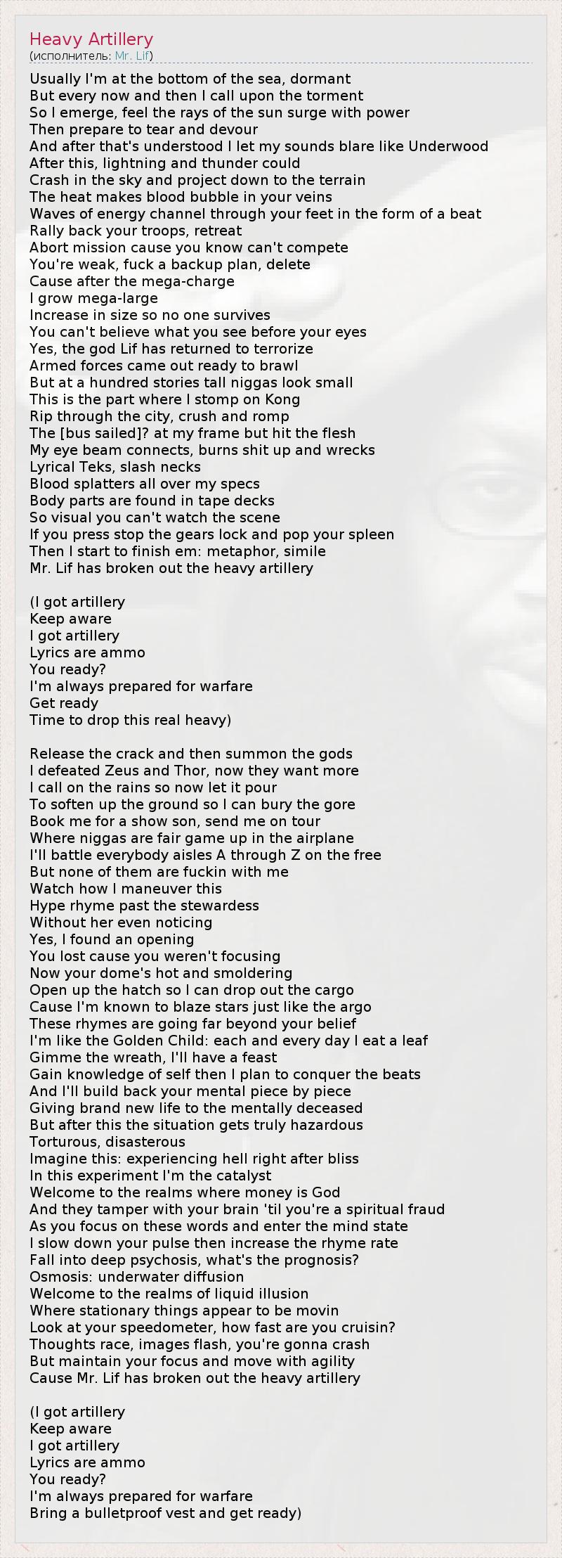 Usually I'm at the bottom of the sea, dormant But every now and then I call upon the torment So I emerge, feel the rays of the sun surge with power Then prepare to tear and devour And after that's understood I let my sounds blare like Underwood After this, lightning and thunder could Crash in the sky and project down to the terrain The heat makes blood bubble in your veins Waves of energy channel through your feet in the form of a beat Rally back your troops, retreat Abort mission cause you know can't compete You're weak, fuck a backup plan, delete Cause after the mega-charge I grow mega-large Increase in size so no one survives You can't believe what you see before your eyes Yes, the god Lif has returned to terrorize Armed forces came out ready to brawl But at a hundred stories tall niggas look small This is the part where I stomp on Kong Rip through the city, crush and romp The [bus sailed]? at my frame but hit the flesh My eye beam connects, burns shit up and wrecks Lyrical Teks, slash necks Blood splatters all over my specs Body parts are found in tape decks So visual you can't watch the scene If you press stop the gears lock and pop your spleen Then I start to finish em: metaphor, simile Mr. Lif has broken out the heavy artillery (I got artillery Keep aware I got artillery Lyrics are ammo You ready? I'm always prepared for warfare Get ready Time to drop this real heavy) Release the crack and then summon the gods I defeated Zeus and Thor, now they want more I call on the rains so now let it pour To soften up the ground so I can bury the gore Book me for a show son, send me on tour Where niggas are fair game up in the airplane I'll battle everybody aisles A through Z on the free But none of them are fuckin with me Watch how I maneuver this Hype rhyme past the stewardess Without her even noticing Yes, I found an opening You lost cause you weren't focusing Now your dome's hot and smoldering Open up the hatch so I can drop out the cargo Cause I'm known to blaze stars just like the argo These rhymes are going far beyond your belief I'm like the Golden Child: each and every day I eat a leaf Gimme the wreath, I'll have a feast Gain knowledge of self then I plan to conquer the beats And I'll build back your mental piece by piece Giving brand new life to the mentally deceased But after this the situation gets truly hazardous Torturous, disasterous Imagine this: experiencing hell right after bliss In this experiment I'm the catalyst Welcome to the realms where money is God And they tamper with your brain 'til you're a spiritual fraud As you focus on these words and enter the mind state I slow down your pulse then increase the rhyme rate Fall into deep psychosis, what's the prognosis? Osmosis: underwater diffusion Welcome to the realms of liquid illusion Where stationary things appear to be movin Look at your speedometer, how fast are you cruisin? Thoughts race, images flash, you're gonna crash But maintain your focus and move with agility Cause Mr. Lif has broken out the heavy artillery (I got artillery Keep aware I got artillery Lyrics are ammo You ready? I'm always prepared for warfare Bring a bulletproof vest and get ready)