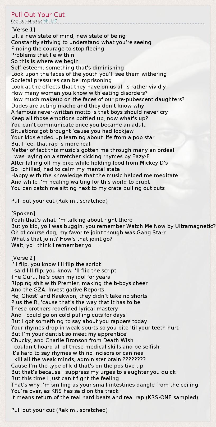 [Verse 1] Lif, a new state of mind, new state of being Constantly striving to understand what you're seeing Finding the courage to stop fleeing Problems that lie within So this is where we begin Self-esteem: something that's diminishing Look upon the faces of the youth you'll see them withering Societal pressures can be imprisoning Look at the effects that they have on us all is rather vividly How many women you know with eating disorders? How much makeup on the faces of our pre-pubescent daughters? Dudes are acting macho and they don't know why A famous never-written motto is that boys should never cry Keep all those emotions bottled up, now what's up? You can't communicate once you became an adult Situations got brought 'cause you had lockjaw Your kids ended up learning about life from a pop star But I feel that rap is more real Matter of fact this music's gotten me through many an ordeal I was laying on a stretcher kicking rhymes by Eazy-E After falling off my bike while holding food from Mickey D's So I chilled, had to calm my mental state Happy with the knowledge that the music helped me meditate And while I'm healing waiting for this world to erupt You can catch me sitting next to my crate pulling out cuts Pull out your cut (Rakim...scratched) [Spoken] Yeah that's what I'm talking about right there But yo kid, yo I was buggin, you remember Watch Me Now by Ultramagnetic? Oh of course dog, my favorite joint though was Gang Starr What's that joint? How's that joint go? Wait, yo I think I remember yo [Verse 2] I'll flip, you know I'll flip the script I said I'll flip, you know I'll flip the script The Guru, he's been my idol for years Ripping shit with Premier, making the b-boys cheer And the GZA, Investigative Reports He, Ghost' and Raekwon, they didn't take no shorts Plus the R, 'cause that's the way that it has to be These brothers redefined lyrical mastery And I could go on cold pulling cuts for days But I got something to say about you rappers today Your rhymes drop in weak spurts so you bite 'til your teeth hurt But I'm your dentist so meet my apprentice Chucky, and Charlie Bronson from Death Wish I couldn't hoard all of these medical skills and be selfish It's hard to say rhymes with no incisors or canines I kill all the weak minds, administer brain ???????? Cause I'm the type of kid that's on the positive tip But that's because I suppress my urges to slaughter you quick But this time I just can't fight the feeling That's why I'm smiling as your small intestines dangle from the ceiling You're over, as KRS has said on the track It means return of the real hard beats and real rap (KRS-ONE sampled) Pull out your cut (Rakim...scratched)