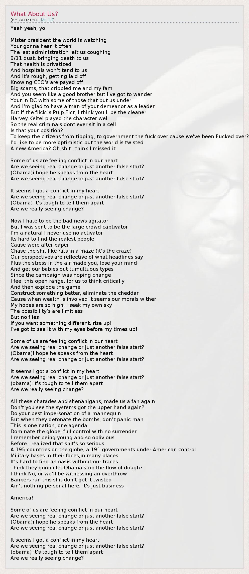 Yeah yeah, yo Mister president the world is watching Your gonna hear it often The last administration left us coughing 9/11 dust, bringing death to us That health is privatized And hospitals won't tend to us And it's rough, getting laid off Knowing CEO's are payed off Big scams, that crippled me and my fam And you seem like a good brother but I've got to wander Your in DC with some of those that put us under And I'm glad to have a man of your demeanor as a leader But if the flick is Pulp Fict, I think you'll be the cleaner Harvey Keitel played the character well So the real criminals dont ever sit in a cell Is that your position? To keep the citizens from tipping, to government the fuck over cause we've been Fucked over? I'd like to be more optimistic but the world is twisted A new America? Oh shit I think I missed it Some of us are feeling conflict in our heart Are we seeing real change or just another false start? (Obama)i hope he speaks from the heart Are we seeing real change or just another false start? It seems I got a conflict in my heart Are we seeing real change or just another false start? (Obama) it's tough to tell them apart Are we really seeing change? Now I hate to be the bad news agitator But I was sent to be the large crowd captivator I'm a natural I never use no activator Its hard to find the realest people Cause were after paper Chase the shit like rats in a maze (it's the craze) Our perspectives are reflective of what headlines say Plus the stress in the air made you, lose your mind And get our babies out tumultuous types Since the campaign was hoping change I feel this open range, for us to think critically And then explode the game Construct something better, eliminate the cheddar Cause when wealth is involved it seems our morals wither My hopes are so high, I seek my own sky The possibility's are limitless But no flies If you want something different, rise up! I've got to see it with my eyes before my times up! Some of us are feeling conflict in our heart Are we seeing real change or just another false start? (Obama)i hope he speaks from the heart Are we seeing real change or just another false start? It seems I got a conflict in my heart Are we seeing real change or just another false start? (obama) it's tough to tell them apart Are we really seeing change? All these charades and shenanigans, made us a fan again Don't you see the systems got the upper hand again? Do your best impersonation of a mannequin But when they detonate the bombs, don't panic man This is one nation, one agenda Dominate the globe, full control with no surrender I remember being young and so oblivious Before I realized that shit's so serious A 195 countries on the globe, a 191 governments under American control Military bases in their faces,in many places It's hard to find an oasis without our traces Think they gonna let Obama stop the flow of dough? I think No, or we'll be witnessing an overthrow Bankers run this shit don't get it twisted Ain't nothing personal here, it's just business America! Some of us are feeling conflict in our heart Are we seeing real change or just another false start? (Obama)i hope he speaks from the heart Are we seeing real change or just another false start? It seems I got a conflict in my heart Are we seeing real change or just another false start? (obama) it's tough to tell them apart Are we really seeing change?