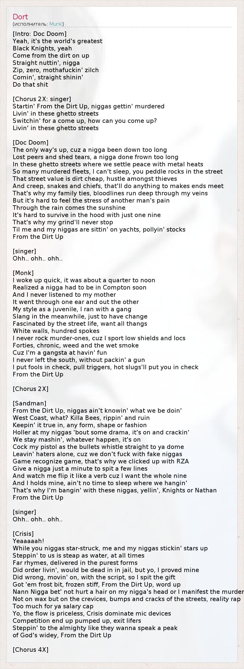[Intro: Doc Doom] Yeah, it's the world's greatest Black Knights, yeah Come from the dirt on up Straight nuttin', nigga Zip, zero, mothafuckin' zilch Comin', straight shinin' Do that shit [Chorus 2X: singer] Startin' From the Dirt Up, niggas gettin' murdered Livin' in these ghetto streets Switchin' for a come up, how can you come up? Livin' in these ghetto streets [Doc Doom] The only way's up, cuz a nigga been down too long Lost peers and shed tears, a nigga done frown too long In these ghetto streets where we settle peace with metal heats So many murdered fleets, I can't sleep, you peddle rocks in the street That street value is dirt cheap, hustle amongst thieves And creep, snakes and chiefs, that'll do anything to makes ends meet That's why my family ties, bloodlines run deep through my veins But it's hard to feel the stress of another man's pain Through the rain comes the sunshine It's hard to survive in the hood with just one nine That's why my grind'll never stop Til me and my niggas are sittin' on yachts, pollyin' stocks From the Dirt Up [singer] Ohh.. ohh.. ohh.. [Monk] I woke up quick, it was about a quarter to noon Realized a nigga had to be in Compton soon And I never listened to my mother It went through one ear and out the other My style as a juvenile, I ran with a gang Slang in the meanwhile, just to have change Fascinated by the street life, want all thangs White walls, hundred spokes I never rock murder-ones, cuz I sport low shields and locs Forties, chronic, weed and the wet smoke Cuz I'm a gangsta at havin' fun I never left the south, without packin' a gun I put fools in check, pull triggers, hot slugs'll put you in check From the Dirt Up [Chorus 2X] [Sandman] From the Dirt Up, niggas ain't knowin' what we be doin' West Coast, what? Killa Bees, rippin' and ruin Keepin' it true in, any form, shape or fashion Holler at my niggas 'bout some drama, it's on and crackin' We stay mashin', whatever happen, it's on Cock my pistol as the bullets whistle straight to ya dome Leavin' haters alone, cuz we don't fuck with fake niggas Game recognize game, that's why we clicked up with RZA Give a nigga just a minute to spit a few lines And watch me flip it like a verb cuz I want the whole nine And I holds mine, ain't no time to sleep where we hangin' That's why I'm bangin' with these niggas, yellin', Knights or Nathan From the Dirt Up [singer] Ohh.. ohh.. ohh.. [Crisis] Yeaaaaah! While you niggas star-struck, me and my niggas stickin' stars up Steppin' to us is steap as water, at all times Far rhymes, delivered in the purest forms Did order livin', would be dead in in jail, but yo, I proved mine Did wrong, movin' on, with the script, so I spit the gift Got 'em frost bit, frozen stiff, From the Dirt Up, word up Nann Nigga bet' not hurt a hair on my nigga's head or I manifest the murder Not on wax but on the crevices, bumps and cracks of the streets, reality rap Too much for ya salary cap Yo, the flow is priceless, Crisis dominate mic devices Competition end up pumped up, exit lifers Steppin' to the almighty like they wanna speak a peak of God's widey, From the Dirt Up [Chorus 4X]