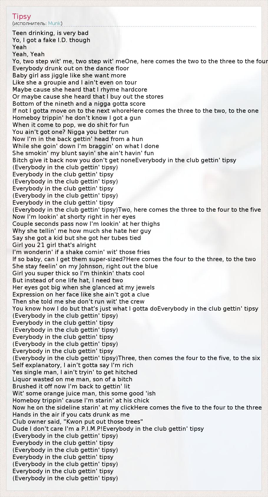 Teen drinking, is very bad Yo, I got a fake I.D. though Yeah Yeah, Yeah Yo, two step wit' me, two step wit' meOne, here comes the two to the three to the four Everybody drunk out on the dance floor Baby girl ass jiggle like she want more Like she a groupie and I ain't even on tour Maybe cause she heard that I rhyme hardcore Or maybe cause she heard that I buy out the stores Bottom of the nineth and a nigga gotta score If not I gotta move on to the next whoreHere comes the three to the two, to the one Homeboy trippin' he don't know I got a gun When it come to pop, we do shit for fun You ain't got one? Nigga you better run Now I'm in the back gettin' head from a hun While she goin' down I'm braggin' on what I done She smokin' my blunt sayin' she ain't havin' fun Bitch give it back now you don't get noneEverybody in the club gettin' tipsy (Everybody in the club gettin' tipsy) Everybody in the club gettin' tipsy (Everybody in the club gettin' tipsy) Everybody in the club gettin' tipsy (Everybody in the club gettin' tipsy) Everybody in the club gettin' tipsy (Everybody in the club gettin' tipsy)Two, here comes the three to the four to the five Now I'm lookin' at shorty right in her eyes Couple seconds pass now I'm lookin' at her thighs Why she tellin' me how much she hate her guy Say she got a kid but she got her tubes tied Girl you 21 girl that's alright I'm wonderin' if a shake comin' wit' those fries If so baby, can I get them super-sized?Here comes the four to the three, to the two She stay feelin' on my Johnson, right out the blue Girl you super thick so I'm thinkin' thats cool But instead of one life hat, I need two Her eyes got big when she glanced at my jewels Expression on her face like she ain't got a clue Then she told me she don't run wit' the crew You know how I do but that's just what I gotta doEverybody in the club gettin' tipsy (Everybody in the club gettin' tipsy) Everybody in the club gettin' tipsy (Everybody in the club gettin' tipsy) Everybody in the club gettin' tipsy (Everybody in the club gettin' tipsy) Everybody in the club gettin' tipsy (Everybody in the club gettin' tipsy)Three, then comes the four to the five, to the six Self explanatory, I ain't gotta say I'm rich Yes single man, I ain't tryin' to get hitched Liquor wasted on me man, son of a bitch Brushed it off now I'm back to gettin' lit Wit' some orange juice man, this some good 'ish Homeboy trippin' cause I'm starin' at his chick Now he on the sideline starin' at my clickHere comes the five to the four to the three Hands in the air if you cats drunk as me Club owner said, "Kwon put out those trees" Dude I don't care I'm a P.I.M.P!Everybody in the club gettin' tipsy (Everybody in the club gettin' tipsy) Everybody in the club gettin' tipsy (Everybody in the club gettin' tipsy) Everybody in the club gettin' tipsy (Everybody in the club gettin' tipsy) Everybody in the club gettin' tipsy (Everybody in the club gettin' tipsy)