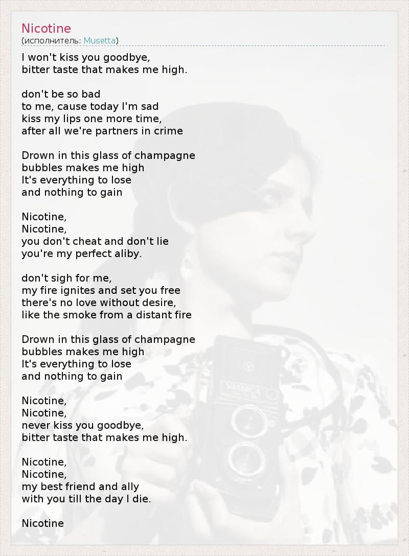 I won't kiss you goodbye, bitter taste that makes me high. don't be so bad to me, cause today I'm sad kiss my lips one more time, after all we're partners in crime Drown in this glass of champagne bubbles makes me high It's everything to lose and nothing to gain Nicotine, Nicotine, you don't cheat and don't lie you're my perfect aliby. don't sigh for me, my fire ignites and set you free there's no love without desire, like the smoke from a distant fire Drown in this glass of champagne bubbles makes me high It's everything to lose and nothing to gain Nicotine, Nicotine, never kiss you goodbye, bitter taste that makes me high. Nicotine, Nicotine, my best friend and ally with you till the day I die. Nicotine