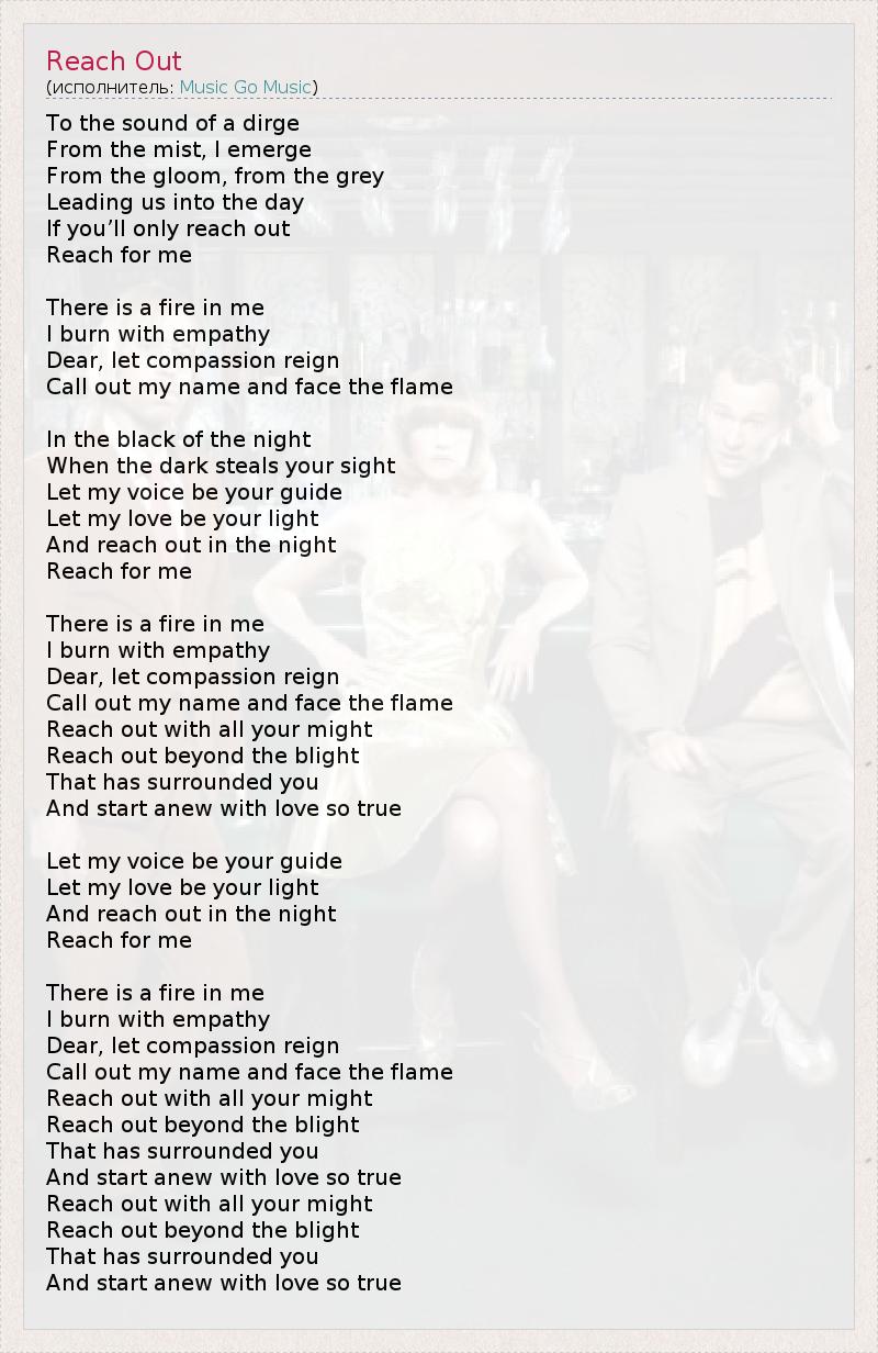 To the sound of a dirge From the mist, I emerge From the gloom, from the grey Leading us into the day If you’ll only reach out Reach for me There is a fire in me I burn with empathy Dear, let compassion reign Call out my name and face the flame In the black of the night When the dark steals your sight Let my voice be your guide Let my love be your light And reach out in the night Reach for me There is a fire in me I burn with empathy Dear, let compassion reign Call out my name and face the flame Reach out with all your might Reach out beyond the blight That has surrounded you And start anew with love so true Let my voice be your guide Let my love be your light And reach out in the night Reach for me There is a fire in me I burn with empathy Dear, let compassion reign Call out my name and face the flame Reach out with all your might Reach out beyond the blight That has surrounded you And start anew with love so true Reach out with all your might Reach out beyond the blight That has surrounded you And start anew with love so true