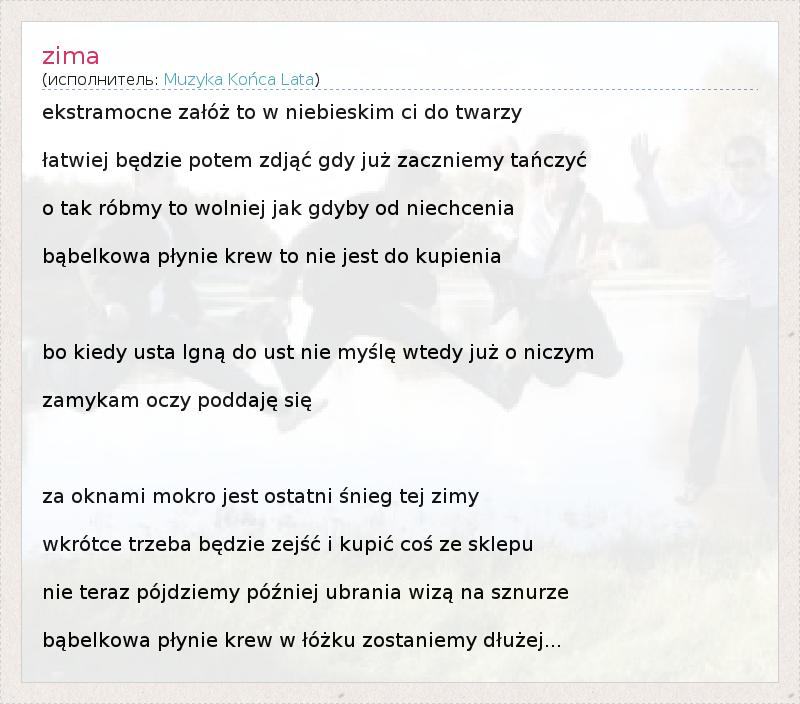 Это интересно:Bajm - польский поп-рок коллектив, был основан в Люблине в 1978 году. Состав несколько раз менялся, но несмотря на это есть один человек от самого начала, это как раз вокалистка и одна из основателей группы - Беата Козидрак (Beata Kozidrak).Группа начала набирать популярность после выступления на "Национальном Фестивале Польских Песен" (Krajowym Festiwalu Piosenki Polskiej) который проходил в Ополе (Opole) в... продолжение