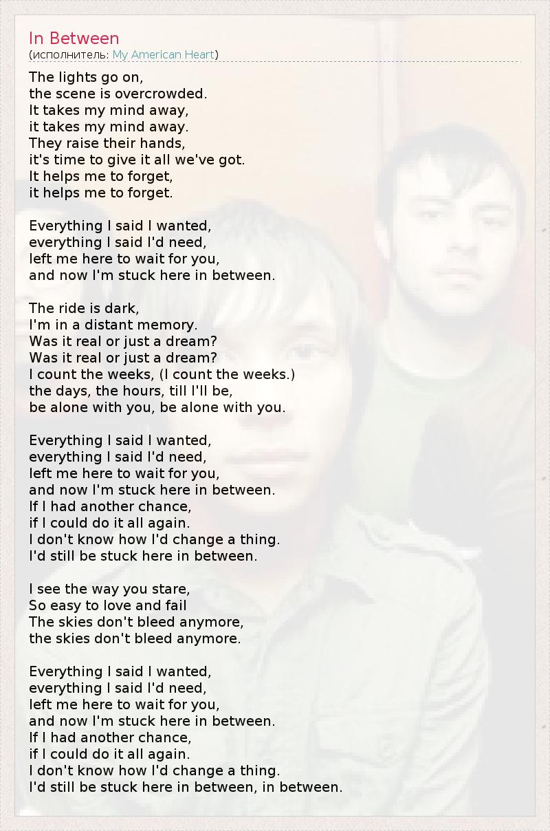 The lights go on, the scene is overcrowded. It takes my mind away, it takes my mind away. They raise their hands, it's time to give it all we've got. It helps me to forget, it helps me to forget. Everything I said I wanted, everything I said I'd need, left me here to wait for you, and now I'm stuck here in between. The ride is dark, I'm in a distant memory. Was it real or just a dream? Was it real or just a dream? I count the weeks, (I count the weeks.) the days, the hours, till I'll be, be alone with you, be alone with you. Everything I said I wanted, everything I said I'd need, left me here to wait for you, and now I'm stuck here in between. If I had another chance, if I could do it all again. I don't know how I'd change a thing. I'd still be stuck here in between. I see the way you stare, So easy to love and fail The skies don't bleed anymore, the skies don't bleed anymore. Everything I said I wanted, everything I said I'd need, left me here to wait for you, and now I'm stuck here in between. If I had another chance, if I could do it all again. I don't know how I'd change a thing. I'd still be stuck here in between, in between.