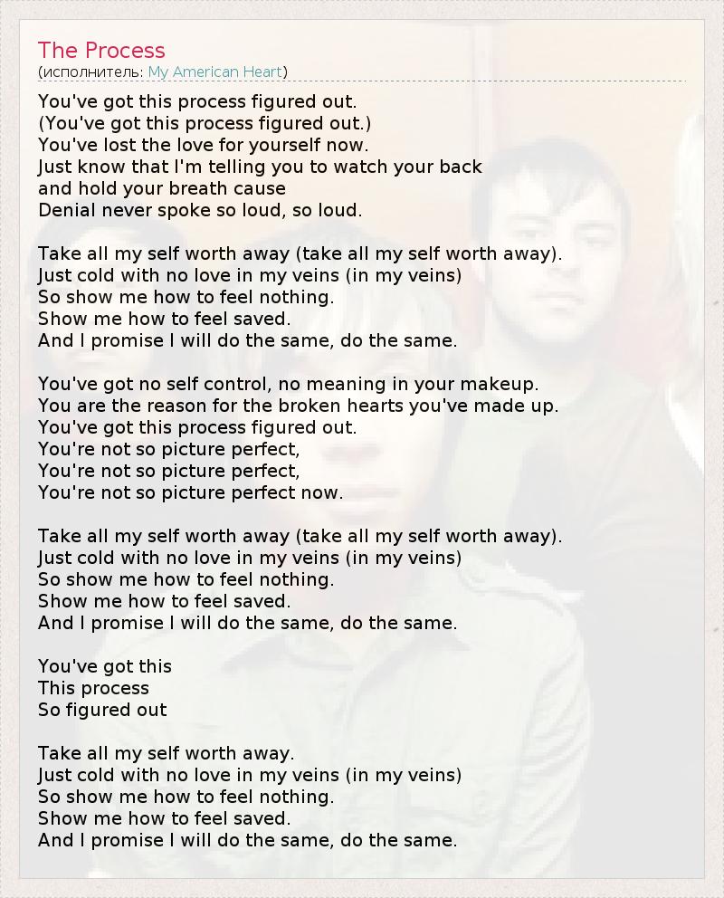 You've got this process figured out. (You've got this process figured out.) You've lost the love for yourself now. Just know that I'm telling you to watch your back and hold your breath cause Denial never spoke so loud, so loud. Take all my self worth away (take all my self worth away). Just cold with no love in my veins (in my veins) So show me how to feel nothing. Show me how to feel saved. And I promise I will do the same, do the same. You've got no self control, no meaning in your makeup. You are the reason for the broken hearts you've made up. You've got this process figured out. You're not so picture perfect, You're not so picture perfect, You're not so picture perfect now. Take all my self worth away (take all my self worth away). Just cold with no love in my veins (in my veins) So show me how to feel nothing. Show me how to feel saved. And I promise I will do the same, do the same. You've got this This process So figured out Take all my self worth away. Just cold with no love in my veins (in my veins) So show me how to feel nothing. Show me how to feel saved. And I promise I will do the same, do the same.
