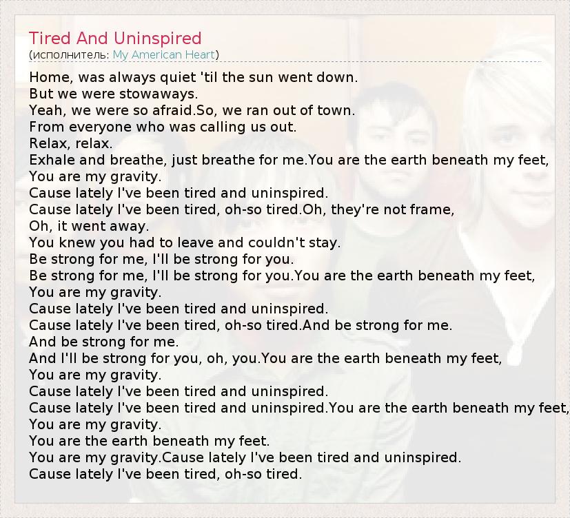 Home, was always quiet 'til the sun went down. But we were stowaways. Yeah, we were so afraid.So, we ran out of town. From everyone who was calling us out. Relax, relax. Exhale and breathe, just breathe for me.You are the earth beneath my feet, You are my gravity. Cause lately I've been tired and uninspired. Cause lately I've been tired, oh-so tired.Oh, they're not frame, Oh, it went away. You knew you had to leave and couldn't stay. Be strong for me, I'll be strong for you. Be strong for me, I'll be strong for you.You are the earth beneath my feet, You are my gravity. Cause lately I've been tired and uninspired. Cause lately I've been tired, oh-so tired.And be strong for me. And be strong for me. And I'll be strong for you, oh, you.You are the earth beneath my feet, You are my gravity. Cause lately I've been tired and uninspired. Cause lately I've been tired and uninspired.You are the earth beneath my feet, You are my gravity. You are the earth beneath my feet. You are my gravity.Cause lately I've been tired and uninspired. Cause lately I've been tired, oh-so tired.