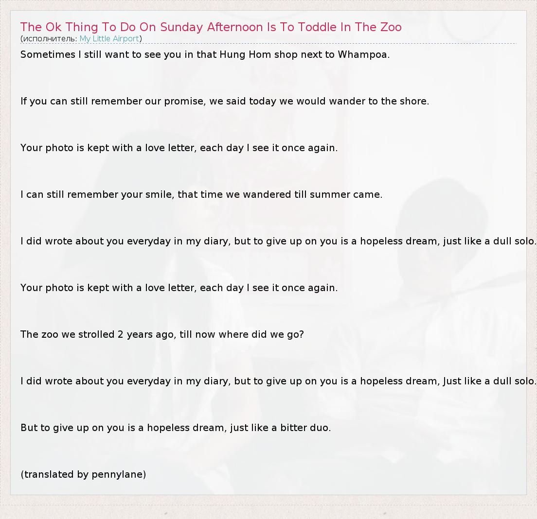 А как ты думаешь, о чем песня "The Ok Thing To Do On Sunday Afternoon Is To Toddle In The Zoo" ?