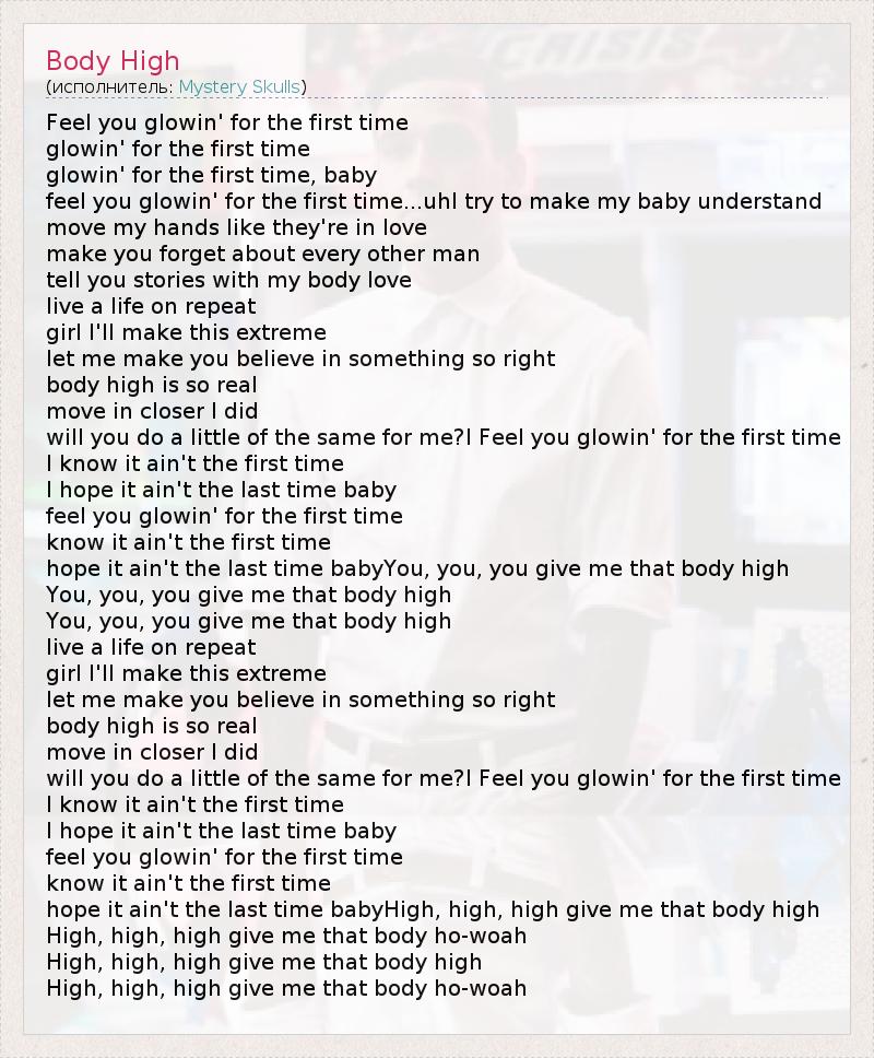 Feel you glowin' for the first time glowin' for the first time glowin' for the first time, baby feel you glowin' for the first time...uhI try to make my baby understand move my hands like they're in love make you forget about every other man tell you stories with my body love live a life on repeat girl I'll make this extreme let me make you believe in something so right body high is so real move in closer I did will you do a little of the same for me?I Feel you glowin' for the first time I know it ain't the first time I hope it ain't the last time baby feel you glowin' for the first time know it ain't the first time hope it ain't the last time babyYou, you, you give me that body high You, you, you give me that body high You, you, you give me that body high live a life on repeat girl I'll make this extreme let me make you believe in something so right body high is so real move in closer I did will you do a little of the same for me?I Feel you glowin' for the first time I know it ain't the first time I hope it ain't the last time baby feel you glowin' for the first time know it ain't the first time hope it ain't the last time babyHigh, high, high give me that body high High, high, high give me that body ho-woah High, high, high give me that body high High, high, high give me that body ho-woah