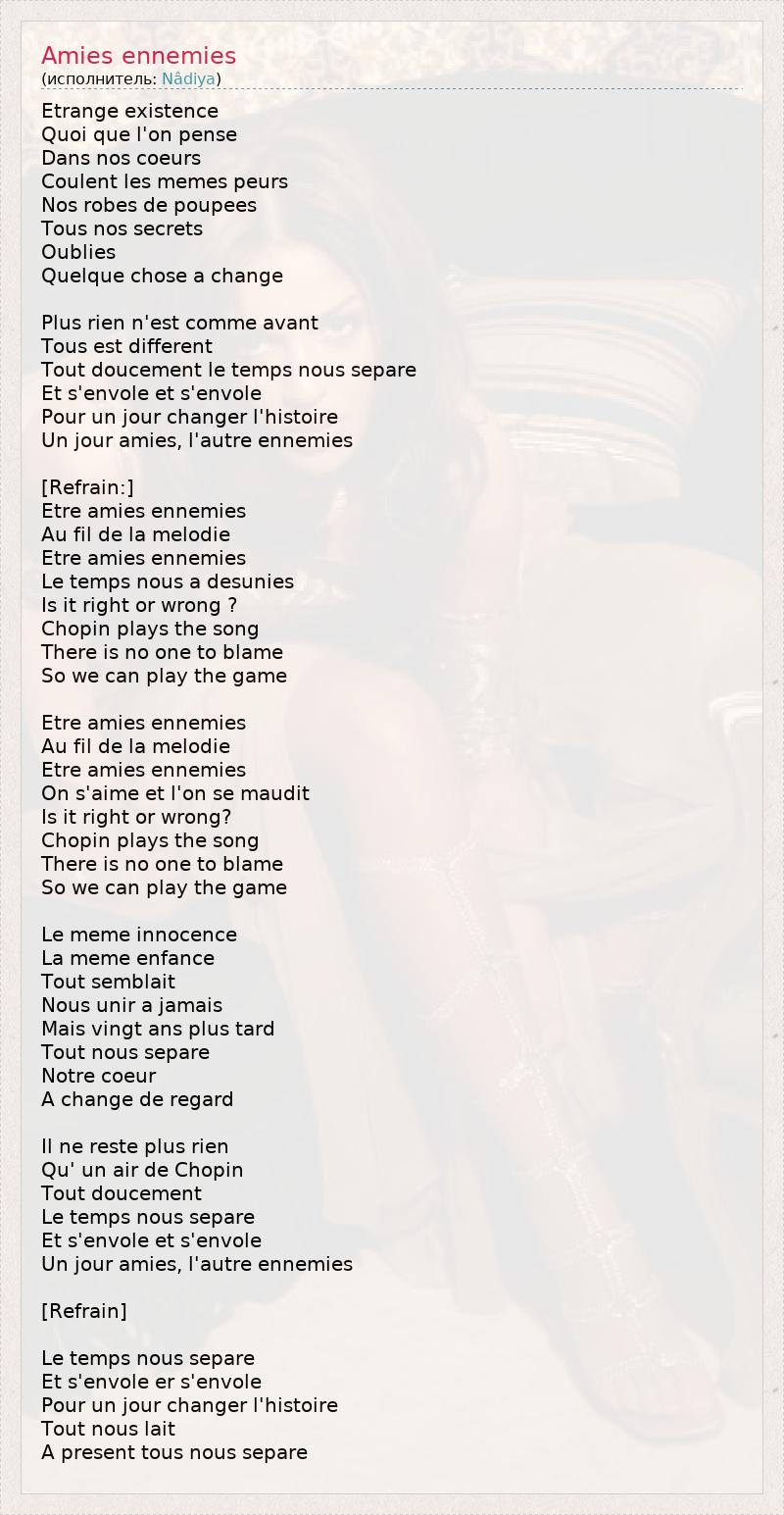 А как ты думаешь, о чем песня "Amies ennemies" ?