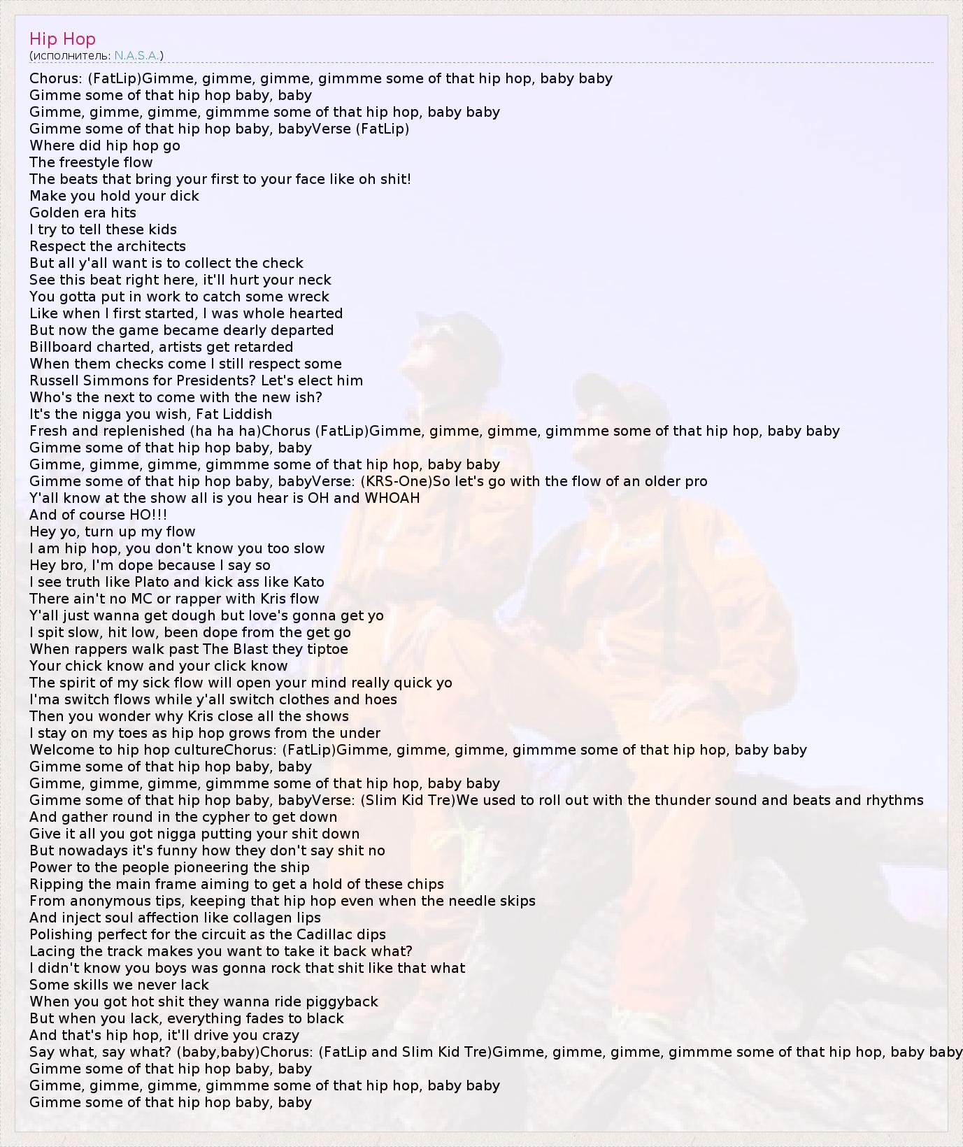Chorus: (FatLip)Gimme, gimme, gimme, gimmme some of that hip hop, baby baby Gimme some of that hip hop baby, baby Gimme, gimme, gimme, gimmme some of that hip hop, baby baby Gimme some of that hip hop baby, babyVerse (FatLip) Where did hip hop go The freestyle flow The beats that bring your first to your face like oh shit! Make you hold your dick Golden era hits I try to tell these kids Respect the architects But all y'all want is to collect the check See this beat right here, it'll hurt your neck You gotta put in work to catch some wreck Like when I first started, I was whole hearted But now the game became dearly departed Billboard charted, artists get retarded When them checks come I still respect some Russell Simmons for Presidents? Let's elect him Who's the next to come with the new ish? It's the nigga you wish, Fat Liddish Fresh and replenished (ha ha ha)Chorus (FatLip)Gimme, gimme, gimme, gimmme some of that hip hop, baby baby Gimme some of that hip hop baby, baby Gimme, gimme, gimme, gimmme some of that hip hop, baby baby Gimme some of that hip hop baby, babyVerse: (KRS-One)So let's go with the flow of an older pro Y'all know at the show all is you hear is OH and WHOAH And of course HO!!! Hey yo, turn up my flow I am hip hop, you don't know you too slow Hey bro, I'm dope because I say so I see truth like Plato and kick ass like Kato There ain't no MC or rapper with Kris flow Y'all just wanna get dough but love's gonna get yo I spit slow, hit low, been dope from the get go When rappers walk past The Blast they tiptoe Your chick know and your click know The spirit of my sick flow will open your mind really quick yo I'ma switch flows while y'all switch clothes and hoes Then you wonder why Kris close all the shows I stay on my toes as hip hop grows from the under Welcome to hip hop cultureChorus: (FatLip)Gimme, gimme, gimme, gimmme some of that hip hop, baby baby Gimme some of that hip hop baby, baby Gimme, gimme, gimme, gimmme some of that hip hop, baby baby Gimme some of that hip hop baby, babyVerse: (Slim Kid Tre)We used to roll out with the thunder sound and beats and rhythms And gather round in the cypher to get down Give it all you got nigga putting your shit down But nowadays it's funny how they don't say shit no Power to the people pioneering the ship Ripping the main frame aiming to get a hold of these chips From anonymous tips, keeping that hip hop even when the needle skips And inject soul affection like collagen lips Polishing perfect for the circuit as the Cadillac dips Lacing the track makes you want to take it back what? I didn't know you boys was gonna rock that shit like that what Some skills we never lack When you got hot shit they wanna ride piggyback But when you lack, everything fades to black And that's hip hop, it'll drive you crazy Say what, say what? (baby,baby)Chorus: (FatLip and Slim Kid Tre)Gimme, gimme, gimme, gimmme some of that hip hop, baby baby Gimme some of that hip hop baby, baby Gimme, gimme, gimme, gimmme some of that hip hop, baby baby Gimme some of that hip hop baby, baby