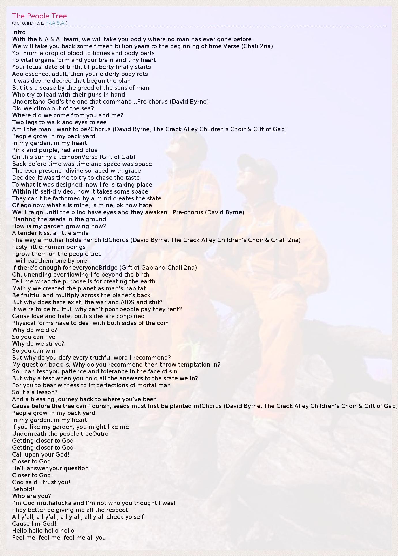 Intro With the N.A.S.A. team, we will take you bodly where no man has ever gone before. We will take you back some fifteen billion years to the beginning of time.Verse (Chali 2na) Yo! From a drop of blood to bones and body parts To vital organs form and your brain and tiny heart Your fetus, date of birth, til puberty finally starts Adolescence, adult, then your elderly body rots It was devine decree that begun the plan But it's disease by the greed of the sons of man Who try to lead with their guns in hand Understand God's the one that command...Pre-chorus (David Byrne) Did we climb out of the sea? Where did we come from you and me? Two legs to walk and eyes to see Am I the man I want to be?Chorus (David Byrne, The Crack Alley Children's Choir & Gift of Gab) People grow in my back yard In my garden, in my heart Pink and purple, red and blue On this sunny afternoonVerse (Gift of Gab) Back before time was time and space was space The ever present I divine so laced with grace Decided it was time to try to chase the taste To what it was designed, now life is taking place Within it' self-divided, now it takes some space They can't be fathomed by a mind creates the state Of ego now what's is mine, is mine, ok now hate We'll reign until the blind have eyes and they awaken...Pre-chorus (David Byrne) Planting the seeds in the ground How is my garden growing now? A tender kiss, a little smile The way a mother holds her childChorus (David Byrne, The Crack Alley Children's Choir & Chali 2na) Tasty little human beings I grow them on the people tree I will eat them one by one If there's enough for everyoneBridge (GIft of Gab and Chali 2na) Oh, unending ever flowing life beyond the birth Tell me what the purpose is for creating the earth Mainly we created the planet as man's habitat Be fruitful and multiply across the planet's back But why does hate exist, the war and AIDS and shit? It we're to be fruitful, why can't poor people pay they rent? Cause love and hate, both sides are conjoined Physical forms have to deal with both sides of the coin Why do we die? So you can live Why do we strive? So you can win But why do you defy every truthful word I recommend? My question back is: Why do you recommend then throw temptation in? So I can test you patience and tolerance in the face of sin But why a test when you hold all the answers to the state we in? For you to bear witness to imperfections of mortal man So it's a lesson? And a blessing journey back to where you've been Cause before the tree can flourish, seeds must first be planted in!Chorus (David Byrne, The Crack Alley Children's Choir & Gift of Gab) People grow in my back yard In my garden, in my heart If you like my garden, you might like me Underneath the people treeOutro Getting closer to God! Getting closer to God! Call upon your God! Closer to God! He'll answer your question! Closer to God! God said I trust you! Behold! Who are you? I'm God muthafucka and I'm not who you thought I was! They better be giving me all the respect All y'all, all y'all, all y'all, all y'all check yo self! Cause I'm God! Hello hello hello hello Feel me, feel me, feel me all you