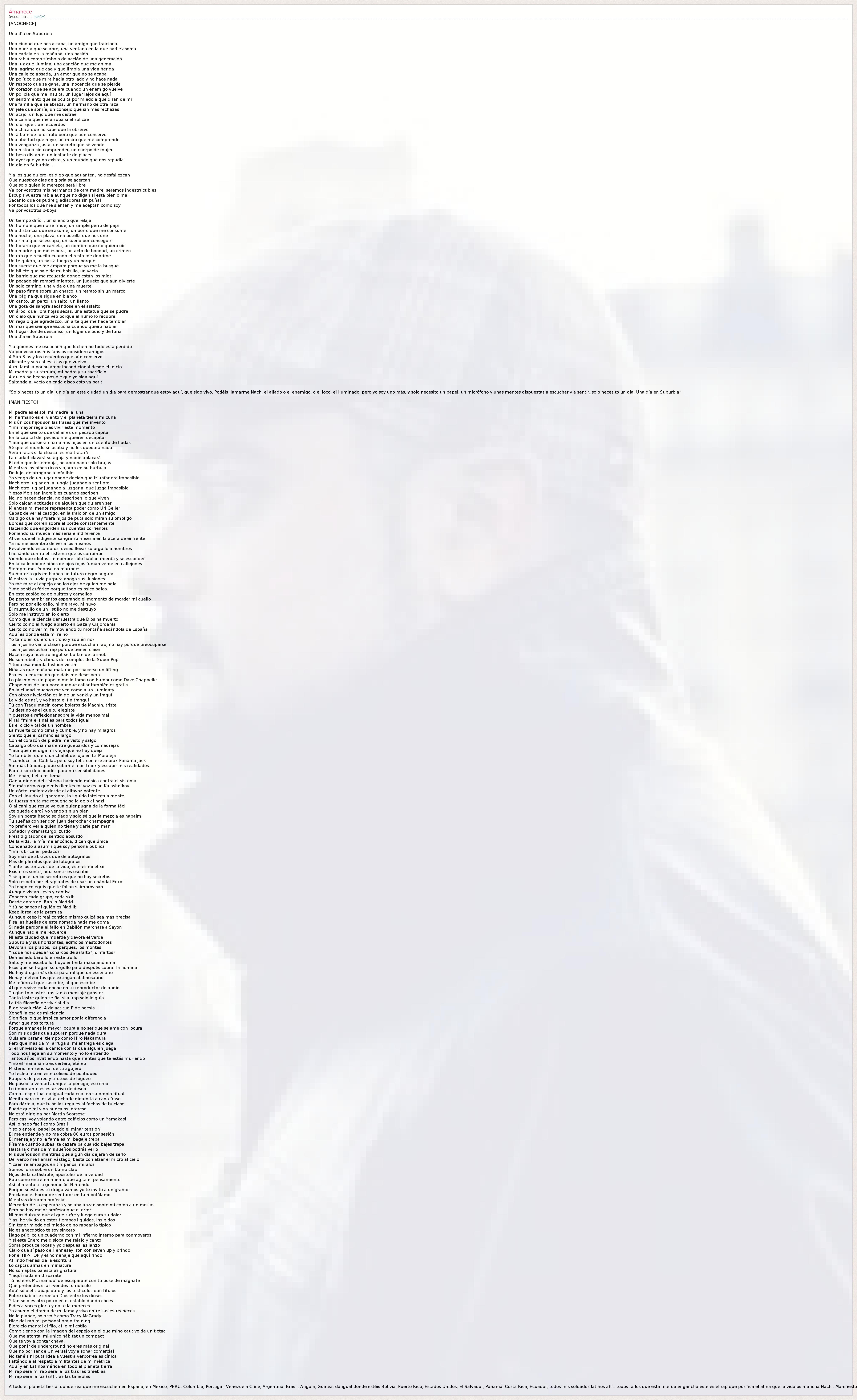 [ANOCHECE] Una día en Suburbia Una ciudad que nos atrapa, un amigo que traiciona Una puerta que se abre, una ventana en la que nadie asoma Una caricia en la mañana, una pasión Una rabia como símbolo de acción de una generación Una luz que ilumina, una canción que me anima Una lagrima que cae y que limpia una vida herida Una calle colapsada, un amor que no se acaba Un político que mira hacia otro lado y no hace nada Un respeto que se gana, una inocencia que se pierde Un corazón que se acelera cuando un enemigo vuelve Un policía que me insulta, un lugar lejos de aquí Un sentimiento que se oculta por miedo a que dirán de mi Una familia que se abraza, un hermano de otra raza Un jefe que sonríe, un consejo que sin más rechazas Un atajo, un lujo que me distrae Una calma que me arropa si el sol cae Un olor que trae recuerdos Una chica que no sabe que la observo Un álbum de fotos roto pero que aún conservo Una libertad que huye, un micro que me comprende Una venganza justa, un secreto que se vende Una historia sin comprender, un cuerpo de mujer Un beso distante, un instante de placer Un ayer que ya no existe, y un mundo que nos repudia Un día en Suburbia … Y a los que quiero les digo que aguanten, no desfallezcan Que nuestros días de gloria se acercan Que solo quien lo merezca será libre Va por vosotros mis hermanos de otra madre, seremos indestructibles Escupir vuestra rabia aunque no digan si está bien o mal Sacar lo que os pudre gladiadores sin puñal Por todos los que me sienten y me aceptan como soy Va por vosotros b-boys Un tiempo difícil, un silencio que relaja Un hombre que no se rinde, un simple perro de paja Una distancia que se asume, un porro que me consume Una noche, una plaza, una botella que nos une Una rima que se escapa, un sueño por conseguir Un horario que encarcela, un nombre que no quiero oír Una madre que me espera, un acto de bondad, un crimen Un rap que resucita cuando el resto me deprime Un te quiero, un hasta luego y un porque Una suerte que me ampara porque yo me la busque Un billete que sale de mi bolsillo, un vacío Un barrio que me recuerda donde están los míos Un pecado sin remordimientos, un juguete que aun divierte Un solo camino, una vida o una muerte Un paso firme sobre un charco, un retrato sin un marco Una página que sigue en blanco Un canto, un parto, un salto, un llanto Una gota de sangre secándose en el asfalto Un árbol que llora hojas secas, una estatua que se pudre Un cielo que nunca veo porque el humo lo recubre Un regalo que agradezco, un arte que me hace temblar Un mar que siempre escucha cuando quiero hablar Un hogar donde descanso, un lugar de odio y de furia Una día en Suburbia Y a quienes me escuchen que luchen no todo está perdido Va por vosotros mis fans os considero amigos A San Blas y los recuerdos que aún conservo Alicante y sus calles a las que vuelvo A mi familia por su amor incondicional desde el inicio Mi madre y su ternura, mi padre y su sacrificio A quien ha hecho posible que yo siga aquí Saltando al vacío en cada disco esto va por ti “Solo necesito un día, un día en esta ciudad un día para demostrar que estoy aquí, que sigo vivo. Podéis llamarme Nach, el aliado o el enemigo, o el loco, el iluminado, pero yo soy uno más, y solo necesito un papel, un micrófono y unas mentes dispuestas a escuchar y a sentir, solo necesito un día, Una día en Suburbia” [MANIFIESTO] Mi padre es el sol, mi madre la luna Mi hermano es el viento y el planeta tierra mi cuna Mis únicos hijos son las frases que me invento Y mi mayor regalo es vivir este momento En el que siento que callar es un pecado capital En la capital del pecado me quieren decapitar Y aunque quisiera criar a mis hijos en un cuento de hadas Sé que el mundo se acaba y no les quedará nada Serán ratas si la cloaca les maltratará La ciudad clavará su aguja y nadie aplacará El odio que les empuja, no abra nada solo brujas Mientras los niños ricos viajaran en su burbuja De lujo, de arrogancia infalible Yo vengo de un lugar donde decían que triunfar era imposible Nach otro juglar en la jungla jugando a ser libre Nach otro juglar jugando a juzgar al que juzga impasible Y esos Mc’s tan increíbles cuando escriben No, no hacen ciencia, no describen lo que viven Solo calcan actitudes de alguien que quieren ser Mientras mi mente representa poder como Uri Geller Capaz de ver el castigo, en la traición de un amigo Os digo que hay fuera hijos de puta solo miran su ombligo Bordes que corren sobre el borde constantemente Haciendo que engorden sus cuentas corrientes Poniendo su mueca más seria e indiferente Al ver que el indigente sangra su miseria en la acera de enfrente Ya no me asombro de ver a los mismos Revolviendo escombros, deseo llevar su orgullo a hombros Luchando contra el sistema que os corrompe Viendo que idiotas sin nombre solo hablan mierda y se esconden En la calle donde niños de ojos rojos fuman verde en callejones Siempre metiéndose en marrones Su materia gris en blanco un futuro negro augura Mientras la lluvia purpura ahoga sus ilusiones Yo me mire al espejo con los ojos de quien me odia Y me sentí eufórico porque todo es psicológico En este zoológico de buitres y camellos De perros hambrientos esperando el momento de morder mi cuello Pero no por ello callo, ni me rayo, ni huyo El murmullo de un listillo no me destruyo Solo me instruyo en lo cierto Como que la ciencia demuestra que Dios ha muerto Cierto como el fuego abierto en Gaza y Cisjordania Cierto como ver mi fe moviendo tu montaña sacándola de España Aquí es donde está mi reino Yo también quiero un trono y ¿quién no? Tus hijos no van a clases porque escuchan rap, no hay porque preocuparse Tus hijos escuchan rap porque tienen clase Hacen suyo nuestro argot se burlan de lo snob No son robots, victimas del complot de la Super Pop Y toda esa mierda fashion victim Niñatas que mañana mataran por hacerse un lifting Esa es la educación que dais me desespera Lo plasmo 