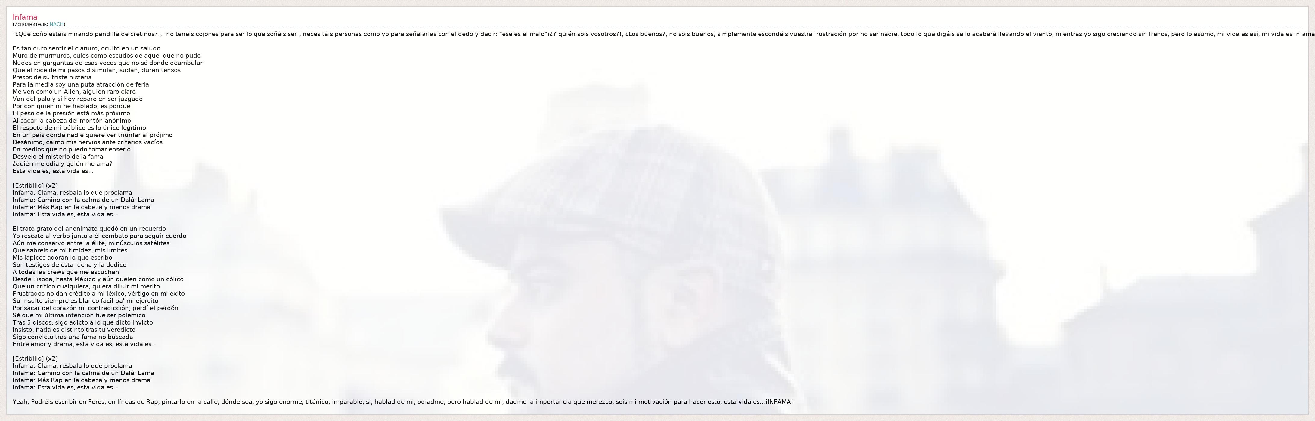 Yeah, Podréis escribir en Foros, en líneas de Rap, pintarlo en la calle, dónde sea, yo sigo enorme, titánico, imparable, si, hablad de mi, odiadme, pero hablad de mi, dadme la importancia que merezco, sois mi motivación para hacer esto, esta vida es...¡INFAMA!