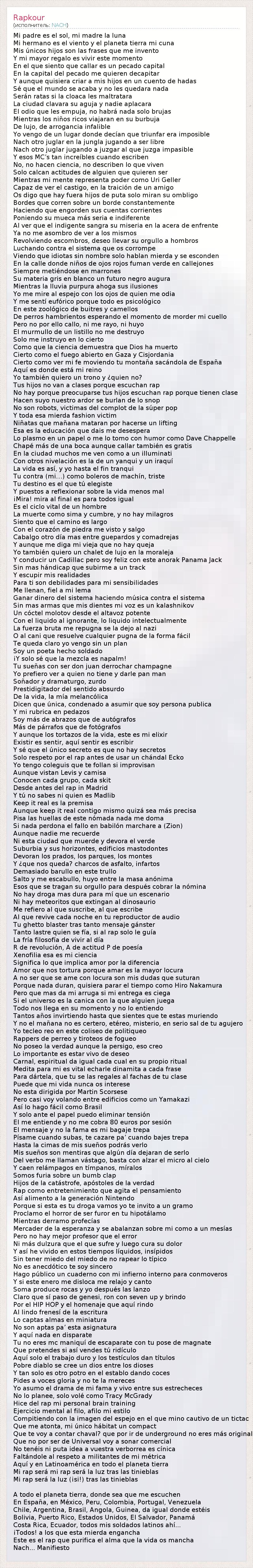Mi padre es el sol, mi madre la luna Mi hermano es el viento y el planeta tierra mi cuna Mis únicos hijos son las frases que me invento Y mi mayor regalo es vivir este momento En el que siento que callar es un pecado capital En la capital del pecado me quieren decapitar Y aunque quisiera criar a mis hijos en un cuento de hadas Sé que el mundo se acaba y no les quedara nada Serán ratas si la cloaca les maltratara La ciudad clavara su aguja y nadie aplacara El odio que les empuja, no habrá nada solo brujas Mientras los niños ricos viajaran en su burbuja De lujo, de arrogancia infalible Yo vengo de un lugar donde decían que triunfar era imposible Nach otro juglar en la jungla jugando a ser libre Nach otro juglar jugando a juzgar al que juzga impasible Y esos MC’s tan increíbles cuando escriben No, no hacen ciencia, no describen lo que viven Solo calcan actitudes de alguien que quieren ser Mientras mi mente representa poder como Uri Geller Capaz de ver el castigo, en la traición de un amigo Os digo que hay fuera hijos de puta solo miran su ombligo Bordes que corren sobre un borde constantemente Haciendo que engorden sus cuentas corrientes Poniendo su mueca más seria e indiferente Al ver que el indigente sangra su miseria en la acera de enfrente Ya no me asombro de ver a los mismos Revolviendo escombros, deseo llevar su orgullo a hombros Luchando contra el sistema que os corrompe Viendo que idiotas sin nombre solo hablan mierda y se esconden En la calle donde niños de ojos rojos fuman verde en callejones Siempre metiéndose en marrones Su materia gris en blanco un futuro negro augura Mientras la lluvia purpura ahoga sus ilusiones Yo me mire al espejo con los ojos de quien me odia Y me sentí eufórico porque todo es psicológico En este zoológico de buitres y camellos De perros hambrientos esperando el momento de morder mi cuello Pero no por ello callo, ni me rayo, ni huyo El murmullo de un listillo no me destruyo Solo me instruyo en lo cierto Como que la ciencia demuestra que Dios ha muerto Cierto como el fuego abierto en Gaza y Cisjordania Cierto como ver mi fe moviendo tu montaña sacándola de España Aquí es donde está mi reino Yo también quiero un trono y ¿quien no? Tus hijos no van a clases porque escuchan rap No hay porque preocuparse tus hijos escuchan rap porque tienen clase Hacen suyo nuestro ardor se burlan de lo snop No son robots, victimas del complot de la súper pop Y toda esa mierda fashion victim Niñatas que mañana mataran por hacerse un lifting Esa es la educación que dais me desespera Lo plasmo en un papel o me lo tomo con humor como Dave Chappelle Chapé más de una boca aunque callar también es gratis En la ciudad muchos me ven como a un illuminati Con otros nivelación es la de un yanqui y un iraquí La vida es así, y yo hasta el fin tranqui Tu contra (mi…) como boleros de machín, triste Tu destino es el que tú elegiste Y puestos a reflexionar sobre la vida menos mal ¡Mira! mira al final es para todos igual Es el ciclo vital de un hombre La muerte como sima y cumbre, y no hay milagros Siento que el camino es largo Con el corazón de piedra me visto y salgo Cabalgo otro día mas entre guepardos y comadrejas Y aunque me diga mi vieja que no hay queja Yo también quiero un chalet de lujo en la moraleja Y conducir un Cadillac pero soy feliz con este anorak Panama Jack Sin mas hándicap que subirme a un track Y escupir mis realidades Para ti son debilidades para mi sensibilidades Me llenan, fiel a mi lema Ganar dinero del sistema haciendo música contra el sistema Sin mas armas que mis dientes mi voz es un kalashnikov Un cóctel molotov desde el altavoz potente Con el liquido al ignorante, lo liquido intelectualmente La fuerza bruta me repugna se la dejo al nazi O al cani que resuelve cualquier pugna de la forma fácil Te queda claro yo vengo sin un plan Soy un poeta hecho soldado ¡Y solo sé que la mezcla es napalm! Tu sueñas con ser don juan derrochar champagne Yo prefiero ver a quien no tiene y darle pan man Soñador y dramaturgo, zurdo Prestidigitador del sentido absurdo De la vida, la mía melancólica Dicen que única, condenado a asumir que soy persona publica Y mi rubrica en pedazos Soy más de abrazos que de autógrafos Más de párrafos que de fotógrafos Y aunque los tortazos de la vida, este es mi elixir Existir es sentir, aquí sentir es escribir Y sé que el único secreto es que no hay secretos Solo respeto por el rap antes de usar un chándal Ecko Yo tengo coleguis que te follan si improvisan Aunque vistan Levis y camisa Conocen cada grupo, cada skit Desde antes del rap in Madrid Y tú no sabes ni quien es Madlib Keep it real es la premisa Aunque keep it real contigo mismo quizá sea más precisa Pisa las huellas de este nómada nada me doma Si nada perdona el fallo en babilón marchare a (Zion) Aunque nadie me recuerde Ni esta ciudad que muerde y devora el verde Suburbia y sus horizontes, edificios mastodontes Devoran los prados, los parques, los montes Y ¿que nos queda? charcos de asfalto, infartos Demasiado barullo en este trullo Salto y me escabullo, huyo entre la masa anónima Esos que se tragan su orgullo para después cobrar la nómina No hay droga mas dura para mí que un escenario Ni hay meteoritos que extingan al dinosaurio Me refiero al que suscribe, al que escribe Al que revive cada noche en tu reproductor de audio Tu ghetto blaster tras tanto mensaje gánster Tanto lastre quien se fía, si al rap solo le guía La fría filosofía de vivir al día R de revolución, A de actitud P de poesía Xenofilia esa es mi ciencia Significa lo que implica amor por la diferencia Amor que nos tortura porque amar es la mayor locura A no ser que se ame con locura son mis dudas que suturan Porque nada duran, quisiera parar el tiempo como Hiro Nakamura Pero que mas da mi arruga si mi entrega es ciega Si el universo es la canica con la que alguien juega Todo nos llega en su momento y no lo entiendo Tantos años invirtiendo hasta que sien