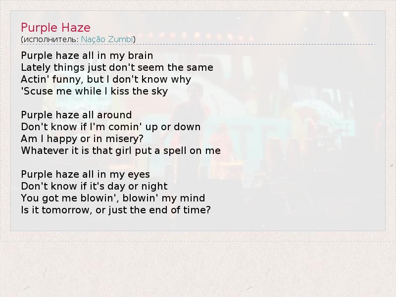 Purple haze all in my brain Lately things just don't seem the same Actin' funny, but I don't know why 'Scuse me while I kiss the sky Purple haze all around Don't know if I'm comin' up or down Am I happy or in misery? Whatever it is that girl put a spell on me Purple haze all in my eyes Don't know if it's day or night You got me blowin', blowin' my mind Is it tomorrow, or just the end of time?