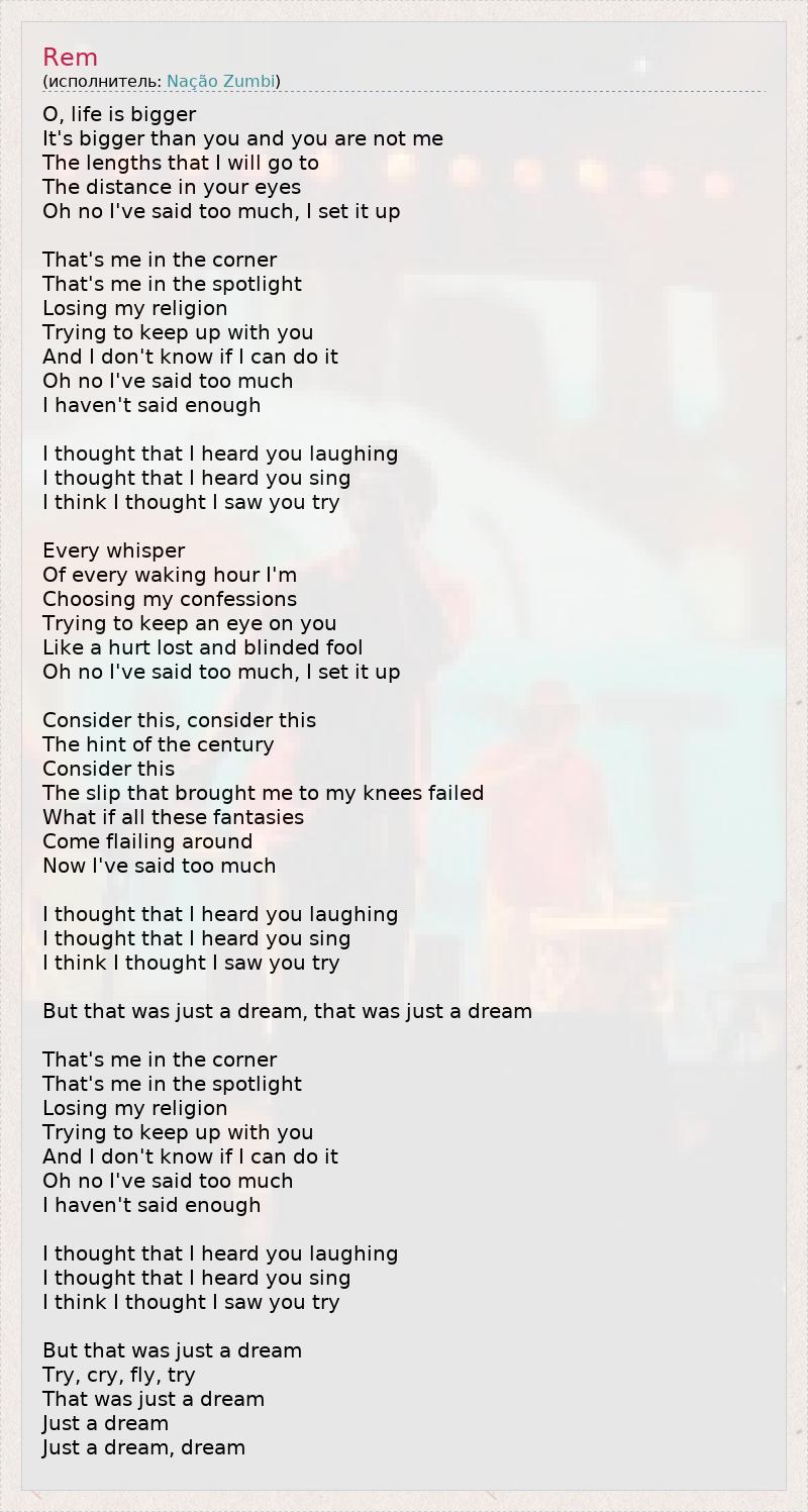 O, life is bigger It's bigger than you and you are not me The lengths that I will go to The distance in your eyes Oh no I've said too much, I set it up That's me in the corner That's me in the spotlight Losing my religion Trying to keep up with you And I don't know if I can do it Oh no I've said too much I haven't said enough I thought that I heard you laughing I thought that I heard you sing I think I thought I saw you try Every whisper Of every waking hour I'm Choosing my confessions Trying to keep an eye on you Like a hurt lost and blinded fool Oh no I've said too much, I set it up Consider this, consider this The hint of the century Consider this The slip that brought me to my knees failed What if all these fantasies Come flailing around Now I've said too much I thought that I heard you laughing I thought that I heard you sing I think I thought I saw you try But that was just a dream, that was just a dream That's me in the corner That's me in the spotlight Losing my religion Trying to keep up with you And I don't know if I can do it Oh no I've said too much I haven't said enough I thought that I heard you laughing I thought that I heard you sing I think I thought I saw you try But that was just a dream Try, cry, fly, try That was just a dream Just a dream Just a dream, dream