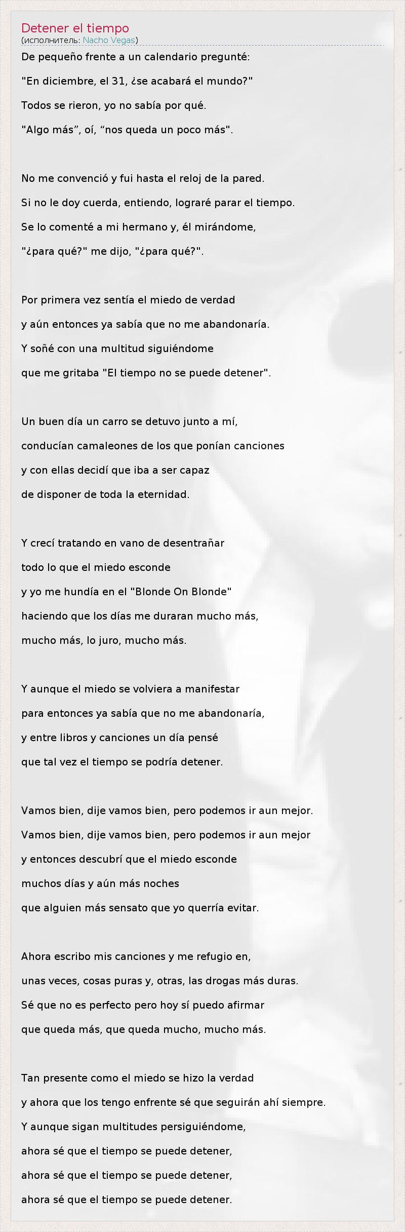 De pequeño frente a un calendario pregunté: "En diciembre, el 31, ¿se acabará el mundo?" Todos se rieron, yo no sabía por qué. "Algo más”, oí, “nos queda un poco más". No me convenció y fui hasta el reloj de la pared. Si no le doy cuerda, entiendo, lograré parar el tiempo. Se lo comenté a mi hermano y, él mirándome, "¿para qué?" me dijo, "¿para qué?". Por primera vez sentía el miedo de verdad y aún entonces ya sabía que no me abandonaría. Y soñé con una multitud siguiéndome que me gritaba "El tiempo no se puede detener". Un buen día un carro se detuvo junto a mí, conducían camaleones de los que ponían canciones y con ellas decidí que iba a ser capaz de disponer de toda la eternidad. Y crecí tratando en vano de desentrañar todo lo que el miedo esconde y yo me hundía en el "Blonde On Blonde" haciendo que los días me duraran mucho más, mucho más, lo juro, mucho más. Y aunque el miedo se volviera a manifestar para entonces ya sabía que no me abandonaría, y entre libros y canciones un día pensé que tal vez el tiempo se podría detener. Vamos bien, dije vamos bien, pero podemos ir aun mejor. Vamos bien, dije vamos bien, pero podemos ir aun mejor y entonces descubrí que el miedo esconde muchos días y aún más noches que alguien más sensato que yo querría evitar. Ahora escribo mis canciones y me refugio en, unas veces, cosas puras y, otras, las drogas más duras. Sé que no es perfecto pero hoy sí puedo afirmar que queda más, que queda mucho, mucho más. Tan presente como el miedo se hizo la verdad y ahora que los tengo enfrente sé que seguirán ahí siempre. Y aunque sigan multitudes persiguiéndome, ahora sé que el tiempo se puede detener, ahora sé que el tiempo se puede detener, ahora sé que el tiempo se puede detener.