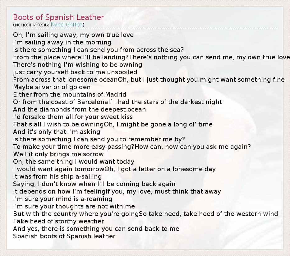 Oh, I'm sailing away, my own true love I'm sailing away in the morning Is there something I can send you from across the sea? From the place where I'll be landing?There's nothing you can send me, my own true love There's nothing I'm wishing to be owning Just carry yourself back to me unspoiled From across that lonesome oceanOh, but I just thought you might want something fine Maybe silver or of golden Either from the mountains of Madrid Or from the coast of BarcelonaIf I had the stars of the darkest night And the diamonds from the deepest ocean I'd forsake them all for your sweet kiss That's all I wish to be owningOh, I might be gone a long ol' time And it's only that I'm asking Is there something I can send you to remember me by? To make your time more easy passing?How can, how can you ask me again? Well it only brings me sorrow Oh, the same thing I would want today I would want again tomorrowOh, I got a letter on a lonesome day It was from his ship a-sailing Saying, I don't know when I'll be coming back again It depends on how I'm feelingIf you, my love, must think that away I'm sure your mind is a-roaming I'm sure your thoughts are not with me But with the country where you're goingSo take heed, take heed of the western wind Take heed of stormy weather And yes, there is something you can send back to me Spanish boots of Spanish leather