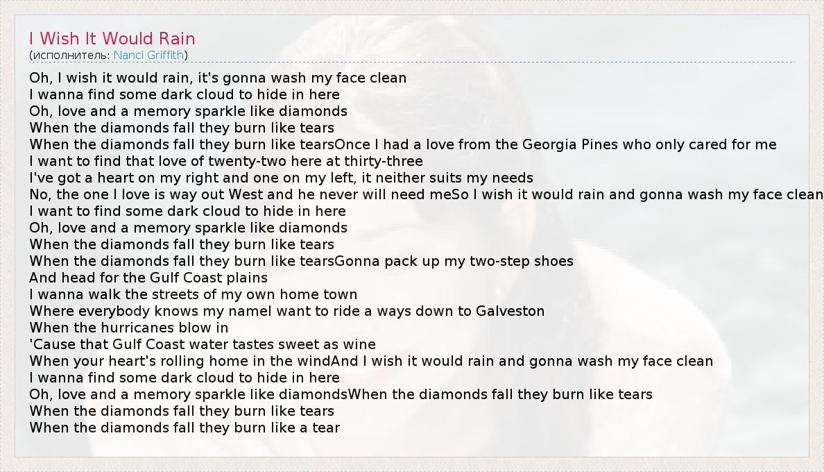 Oh, I wish it would rain, it's gonna wash my face clean I wanna find some dark cloud to hide in here Oh, love and a memory sparkle like diamonds When the diamonds fall they burn like tears When the diamonds fall they burn like tearsOnce I had a love from the Georgia Pines who only cared for me I want to find that love of twenty-two here at thirty-three I've got a heart on my right and one on my left, it neither suits my needs No, the one I love is way out West and he never will need meSo I wish it would rain and gonna wash my face clean I want to find some dark cloud to hide in here Oh, love and a memory sparkle like diamonds When the diamonds fall they burn like tears When the diamonds fall they burn like tearsGonna pack up my two-step shoes And head for the Gulf Coast plains I wanna walk the streets of my own home town Where everybody knows my nameI want to ride a ways down to Galveston When the hurricanes blow in 'Cause that Gulf Coast water tastes sweet as wine When your heart's rolling home in the windAnd I wish it would rain and gonna wash my face clean I wanna find some dark cloud to hide in here Oh, love and a memory sparkle like diamondsWhen the diamonds fall they burn like tears When the diamonds fall they burn like tears When the diamonds fall they burn like a tear