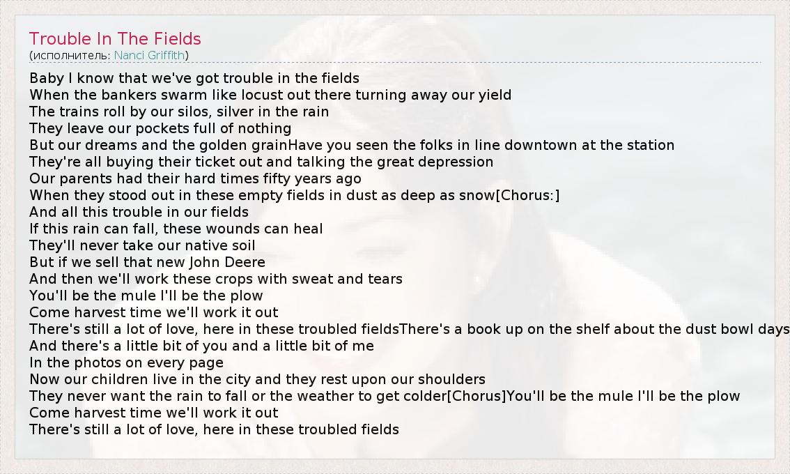 А как ты думаешь, о чем песня "Trouble In The Fields" ?