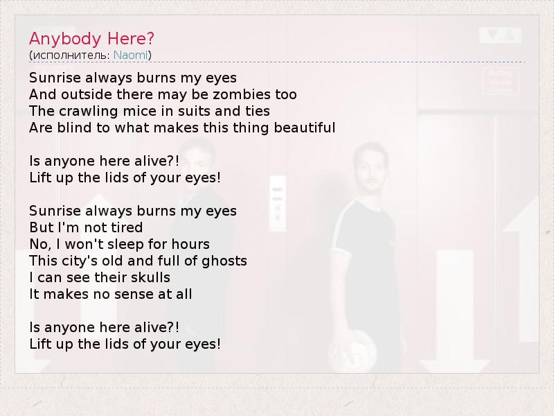 Рассвет постоянно жжет мне глаза, И снаружи тоже могут быть зомби. Ползающие мыши в костюмах и галстуках Слепы к тому, что делает мир прекрасным. Тут есть кто живой? Раскройте же глаза! Рассвет постоянно жжет мне глаза, Но я не устал, Нет, я не буду спать часами. Этот город уже стар и полон призраков, Я вижу их черепа, Это вообще не имеет смысла. Тут есть кто живой? Раскройте же глаза!