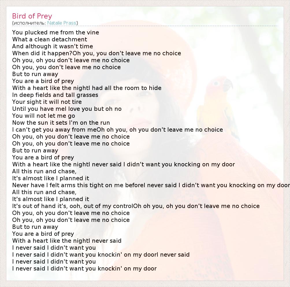 You plucked me from the vine What a clean detachment And although it wasn't time When did it happen?Oh you, you don't leave me no choice Oh you, oh you don't leave me no choice Oh you, you don't leave me no choice But to run away You are a bird of prey With a heart like the nightI had all the room to hide In deep fields and tall grasses Your sight it will not tire Until you have meI love you but oh no You will not let me go Now the sun it sets I'm on the run I can't get you away from meOh oh you, oh you don't leave me no choice Oh you, oh you don't leave me no choice Oh you, oh you don't leave me no choice But to run away You are a bird of prey With a heart like the nightI never said I didn't want you knocking on my door All this run and chase, It's almost like I planned it Never have I felt arms this tight on me beforeI never said I didn't want you knocking on my door All this run and chase, It's almost like I planned it It's out of hand it's, ooh, out of my controlOh oh you, oh you don't leave me no choice Oh you, oh you don't leave me no choice Oh you, oh you don't leave me no choice But to run away You are a bird of prey With a heart like the nightI never said I never said I didn't want you I never said I didn't want you knockin' on my doorI never said I never said I didn't want you I never said I didn't want you knockin' on my door