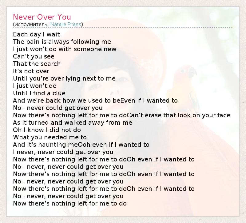 Each day I wait The pain is always following me I just won't do with someone new Can't you see That the search It's not over Until you're over lying next to me I just won't do Until I find a clue And we're back how we used to beEven if I wanted to No I never could get over you Now there's nothing left for me to doCan't erase that look on your face As it turned and walked away from me Oh I know I did not do What you needed me to And it's haunting meOoh even if I wanted to I never, never could get over you Now there's nothing left for me to doOh even if I wanted to No I never, never could get over you Now there's nothing left for me to doOh even if I wanted to No I never, never could get over you Now there's nothing left for me to doOh even if I wanted to No I never, never could get over you Now there's nothing left for me to do